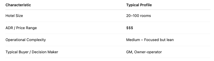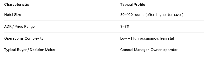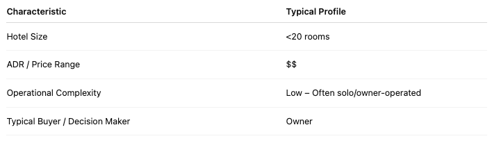 | الملف الشخصي النموذجي للمشتري شركات الإدارة، والعلامات التجارية، والفنادق الفاخرة، والمنتجعات. | الملف الشخصي النموذجي للمشتري أصحاب العقارات الأفراد، وبيوت الضيافة، ومشغلو الخدمات المحدودة. |