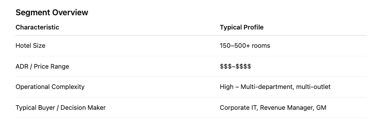 | عمليات تكامل على مستوى المؤسسات | تكامل عميق مع أنظمة نقاط البيع، وأنظمة إدارة الإيرادات، وأنظمة المنتجعات الصحية، وأنظمة إدارة علاقات العملاء، وأدوات الولاء | يُعد تدفق البيانات بين الأقسام أمرًا ضروريًا لتحقيق الكفاءة التشغيلية وتخصيص تجربة الضيوف | اندماج |