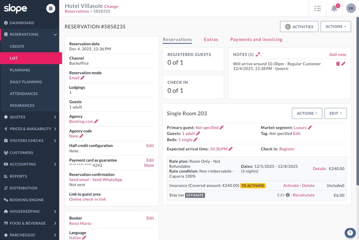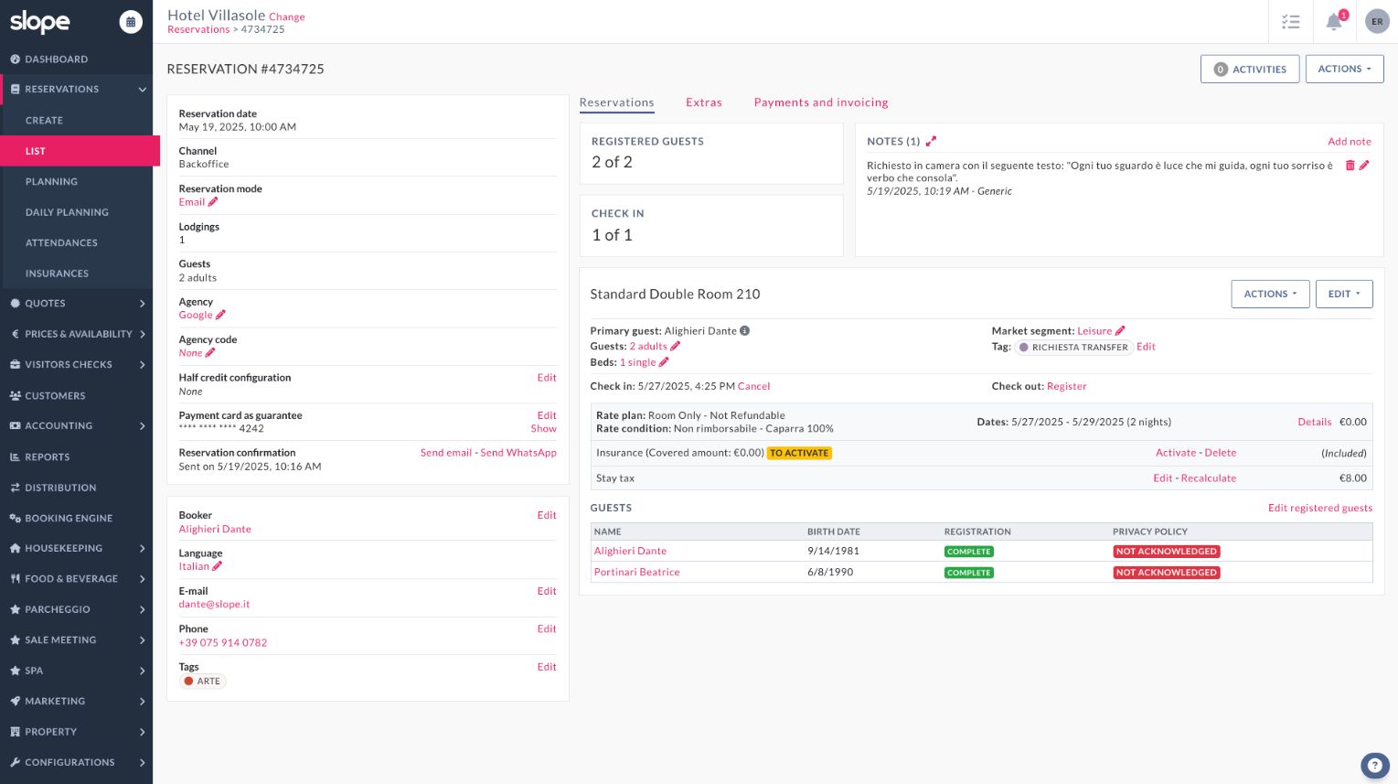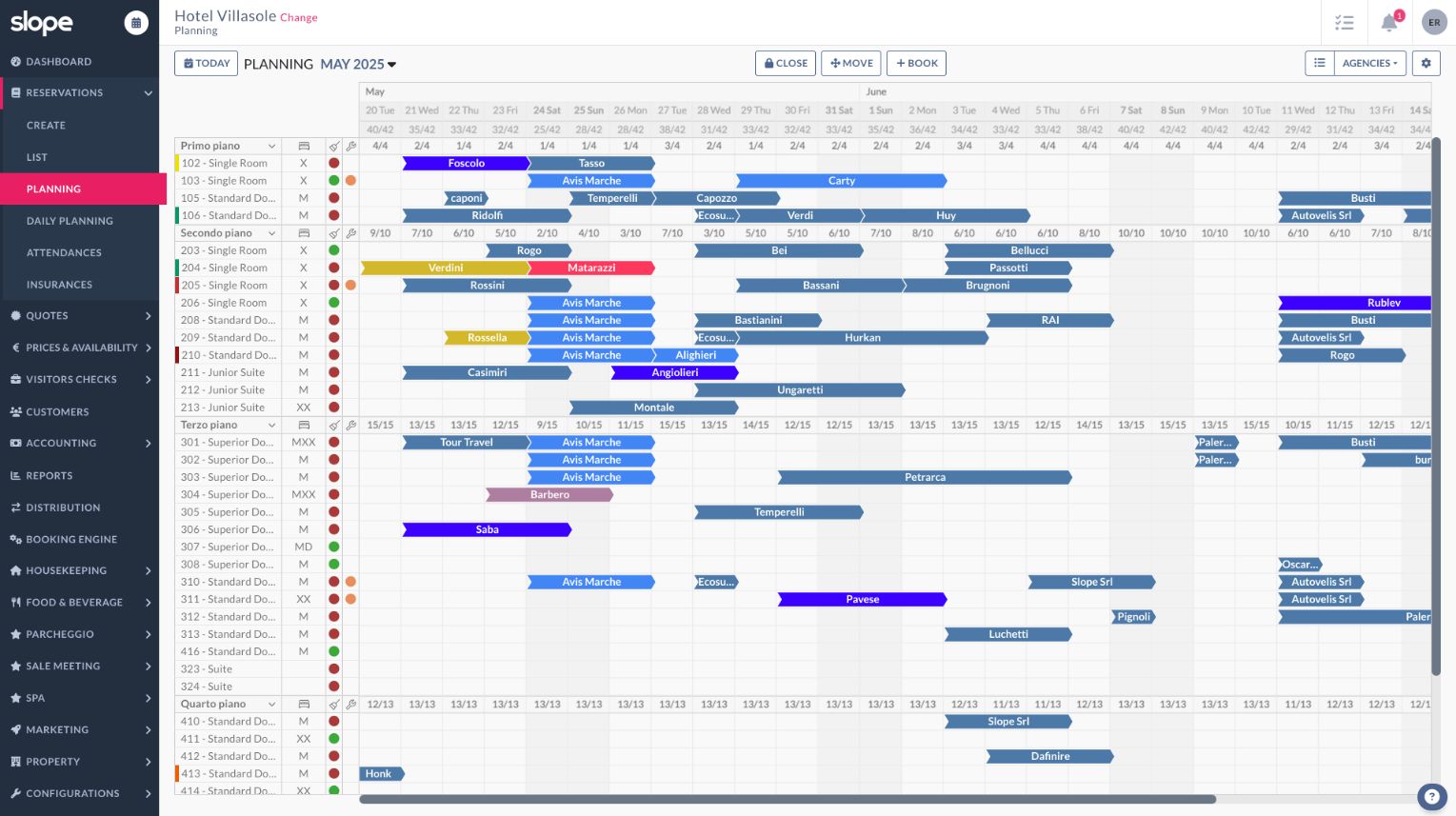 "Slope is an all-in-one cloud management software designed for hotels. Slope includes in a single cloud platform a range of features including PMS, booking engine, channel manager, CRM, sending quotes, RMS, marketing tools, electronic invoicing and telematic payments. Slope is ideal for: - Independent Hotels Slope enables seamless management of every department for operations of any size. This ranges from boutique hotels all the way up to large establishments with hundreds of rooms. -Hotel Groups Features designed to provide easy and comprehensive operational management for hotel chains. This includes group business intelligence, shared guest profiles, multi-account capabilities, and much more - Hotel with restaurant Seamless integration with the Taste Food & Beverage software streamlines workflows between your restaurant and reception areas, making them easy and virtually error-free."