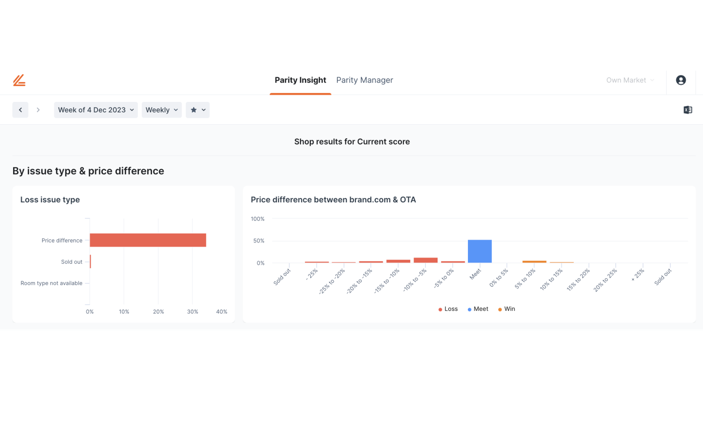 "استمر في التحكم في التوزيع الخاص بك ، تمنح Parity Insight مجموعات الفنادق مجموعة من الأدوات لاكتشاف مشكلات التكافؤ وحلها عبر محفظتها. يتتبع النظام الأساسي سهل الاستخدام أداء التكافؤ الخاص بك على OTAs و metasearch ويقوم بأتمتة إصلاح مشكلات التكافؤ."