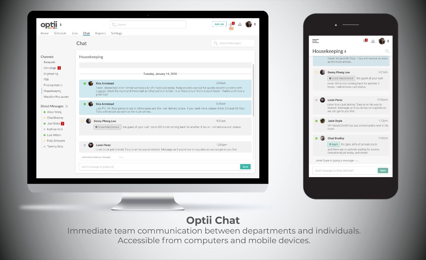 Optii Chat verbindet jeden Mitarbeiter auf jedem Gerät, damit er jederzeit kommunizieren, aktualisieren und engagiert bleiben kann.