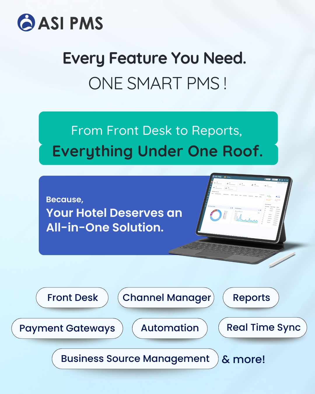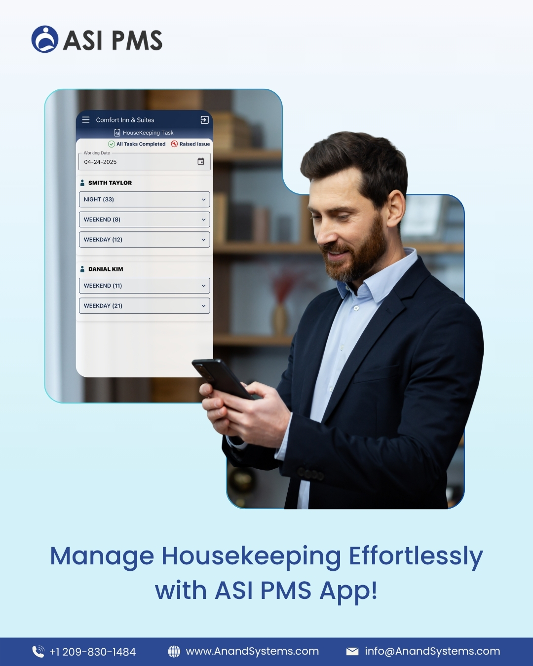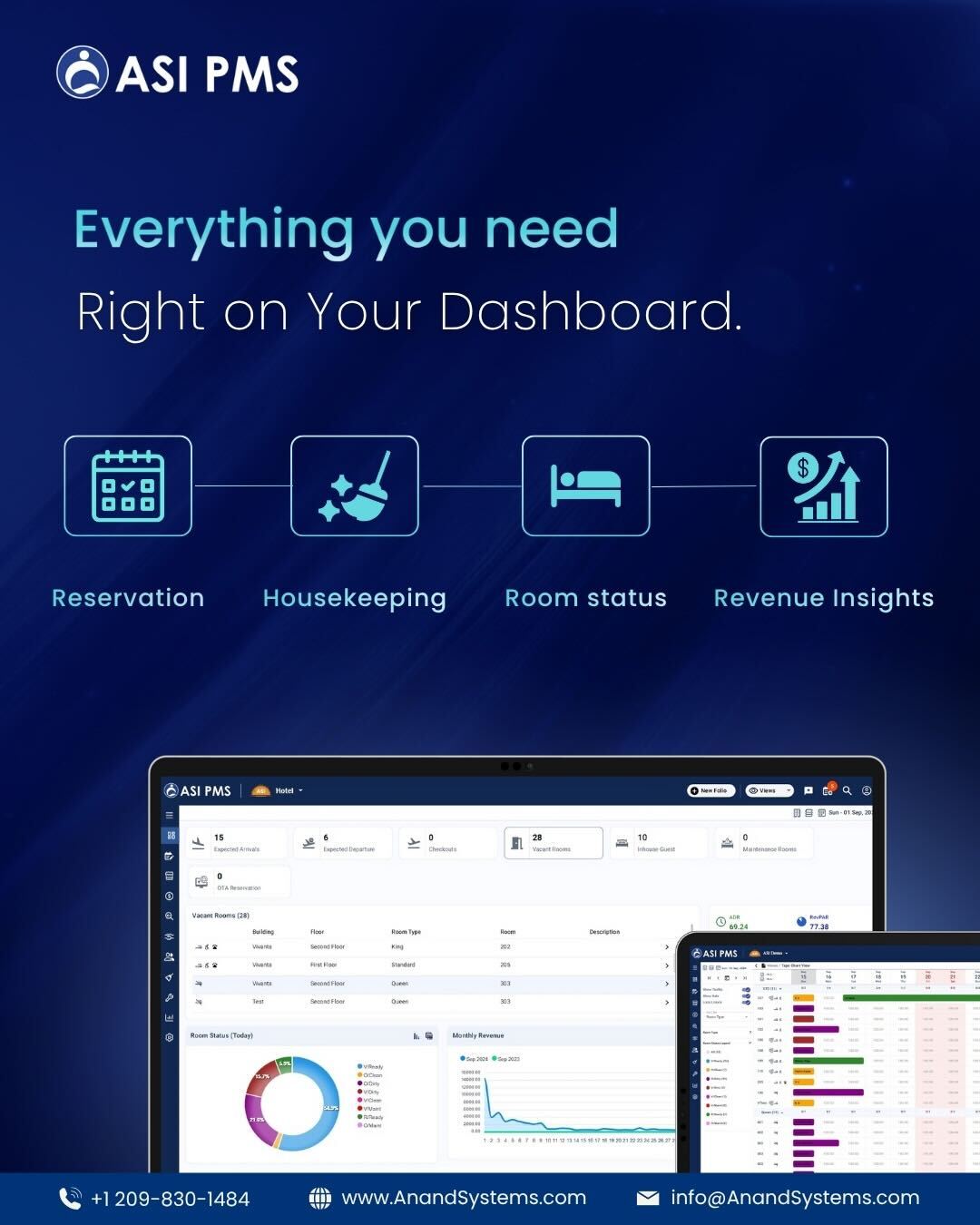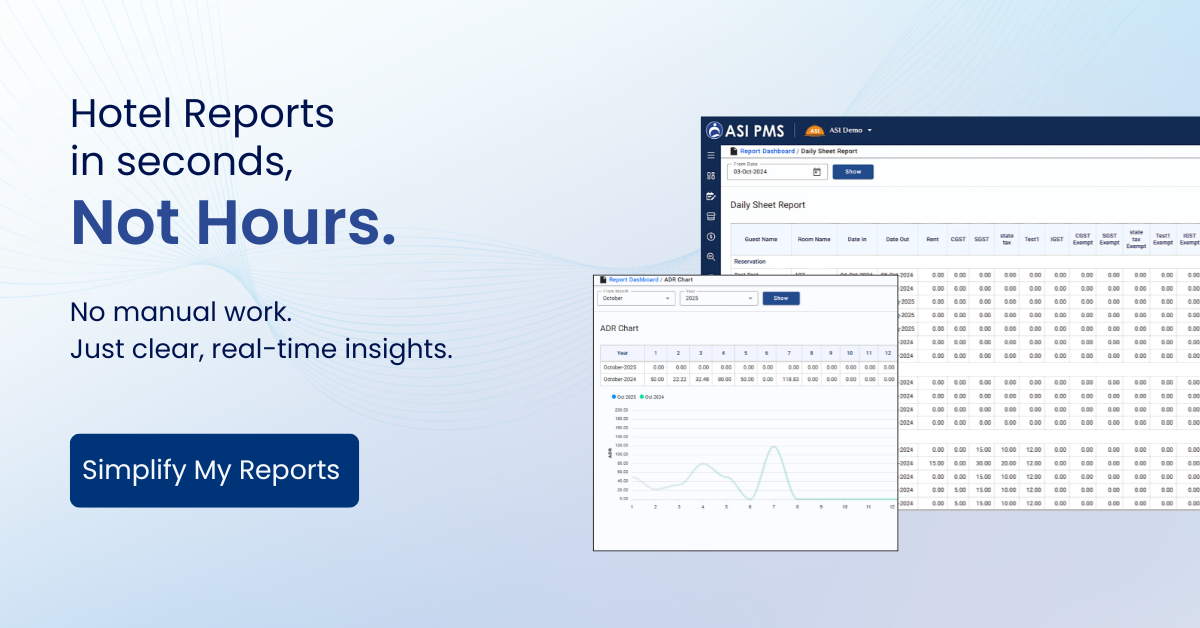 "ASI PMS, a cloud-based PMS, offers advanced tools for reservations, rate management, seamless integrations, and a scalable hotel management system designed to simplify operations and drive business growth. Anand Systems Inc. (ASI) has been a trusted name in hospitality technology for over 26 years, serving more than 7,000 customers worldwide. ASI PMS is a comprehensive property management system designed to streamline every aspect of hotel operations - from reservations and check-ins to billing and housekeeping. With its intuitive interface and powerful functionality, ASI PMS helps hoteliers simplify daily tasks, boost efficiency, and maximize revenue. Its user-friendly design and seamless compatibility offer an intuitive user experience and hassle-free implementation, making it easy for staff to adopt while providing deep reporting tools that help maximize operational performance and revenue. ASI PMS by Anand Systems Inc. is a comprehensive, cloud-based property management system designed to centralize and streamline hotel operations. With its all-in-one dashboard, hoteliers can manage reservations, front desk activities, housekeeping, billing, and more from a single platform. The system offers real-time inventory and rate control to keep availability and pricing updated across all channels, helping to prevent overbookings and optimize revenue. Its advanced reporting tools provide actionable insights into occupancy, financials, and performance metrics, enabling data-driven decisions. ASI PMS also enhances the guest journey with automated email/SMS communications, detailed guest profiles, and feedback tools. Additionally, seamless integrations with OTAs, payment gateways, and third-party systems allow hotels to automate bookings, expand distribution, and eliminate manual errors. With mobile access and support for multi-property management, ASI PMS is built to scale with your business. "