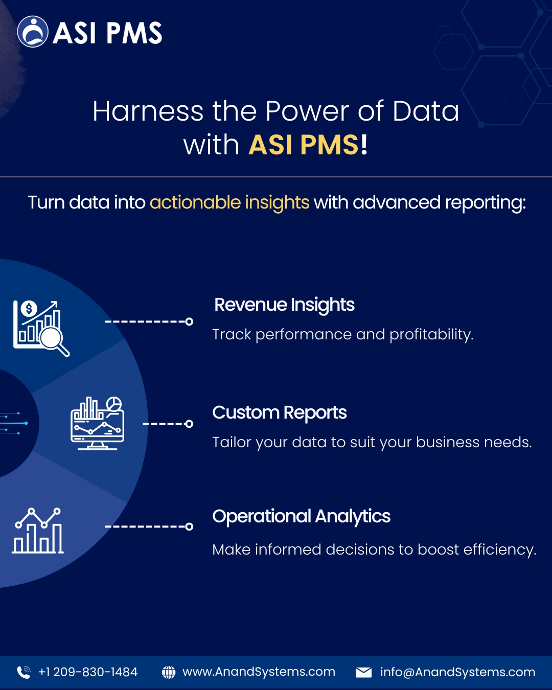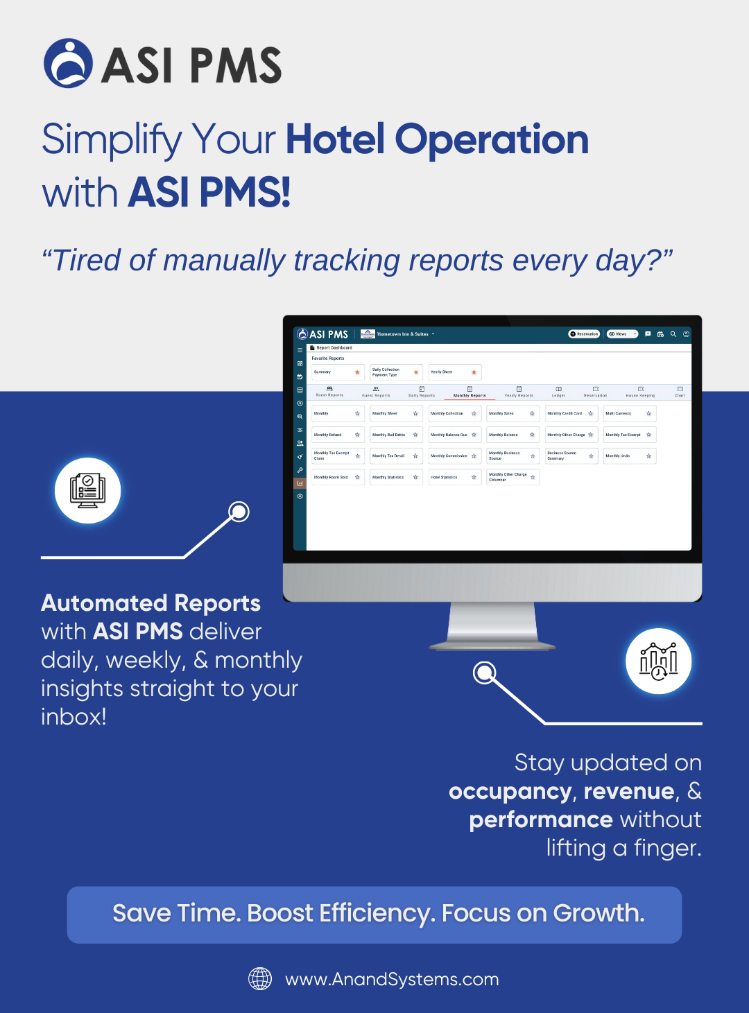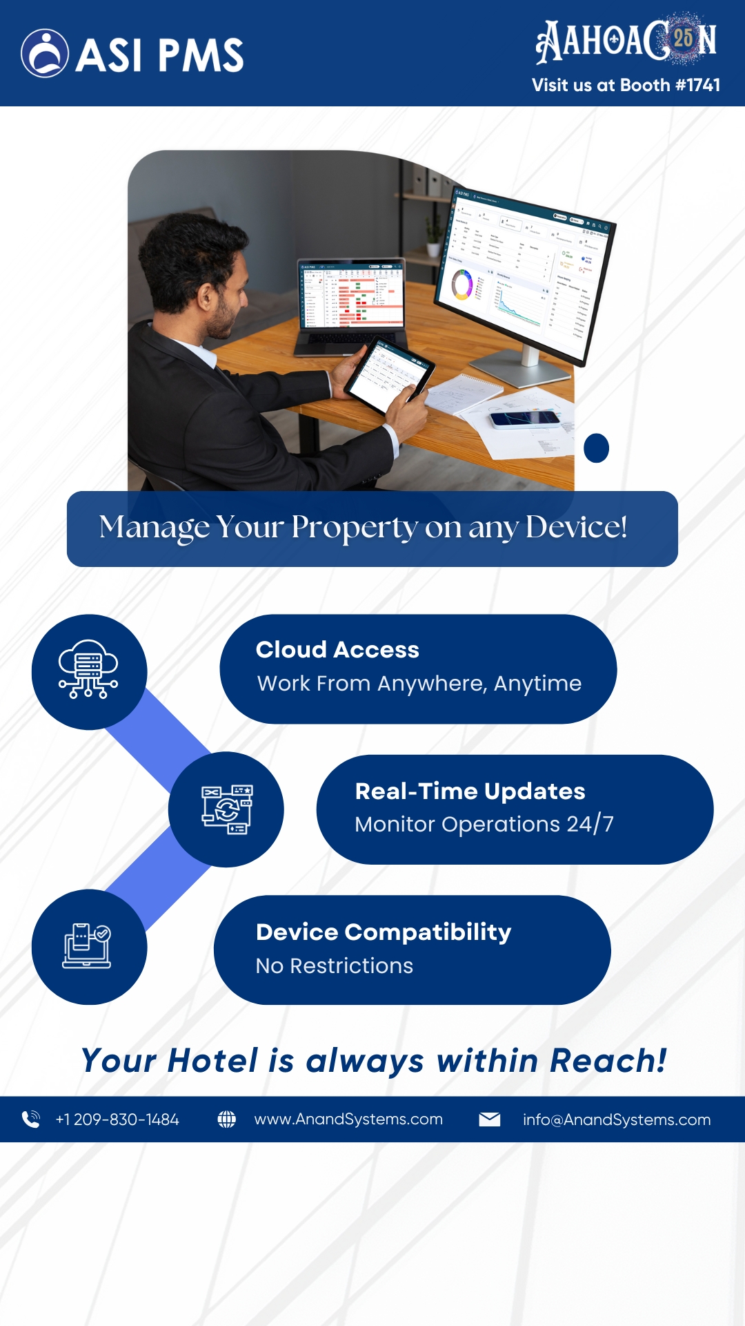 "ASI PMS, a cloud-based PMS, offers advanced tools for reservations, rate management, seamless integrations, and a scalable hotel management system designed to simplify operations and drive business growth. Anand Systems Inc. (ASI) has been a trusted name in hospitality technology for over 26 years, serving more than 7,000 customers worldwide. ASI PMS is a comprehensive property management system designed to streamline every aspect of hotel operations - from reservations and check-ins to billing and housekeeping. With its intuitive interface and powerful functionality, ASI PMS helps hoteliers simplify daily tasks, boost efficiency, and maximize revenue. Its user-friendly design and seamless compatibility offer an intuitive user experience and hassle-free implementation, making it easy for staff to adopt while providing deep reporting tools that help maximize operational performance and revenue. ASI PMS by Anand Systems Inc. is a comprehensive, cloud-based property management system designed to centralize and streamline hotel operations. With its all-in-one dashboard, hoteliers can manage reservations, front desk activities, housekeeping, billing, and more from a single platform. The system offers real-time inventory and rate control to keep availability and pricing updated across all channels, helping to prevent overbookings and optimize revenue. Its advanced reporting tools provide actionable insights into occupancy, financials, and performance metrics, enabling data-driven decisions. ASI PMS also enhances the guest journey with automated email/SMS communications, detailed guest profiles, and feedback tools. Additionally, seamless integrations with OTAs, payment gateways, and third-party systems allow hotels to automate bookings, expand distribution, and eliminate manual errors. With mobile access and support for multi-property management, ASI PMS is built to scale with your business. "
