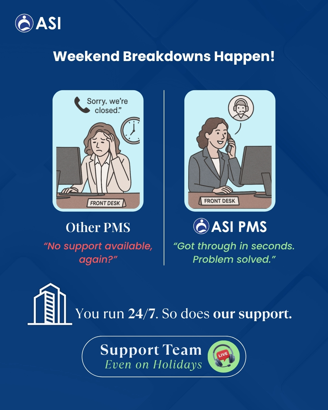"ASI PMS has been a great fit for our operations—simple to use, reliable, and exactly what we need to manage day-to-day hotel functions efficiently. The system makes front desk tasks, reservations, and reporting much more streamlined, which has saved us a lot of time. Overall, very happy with both the software and the support behind it. Highly recommend!"