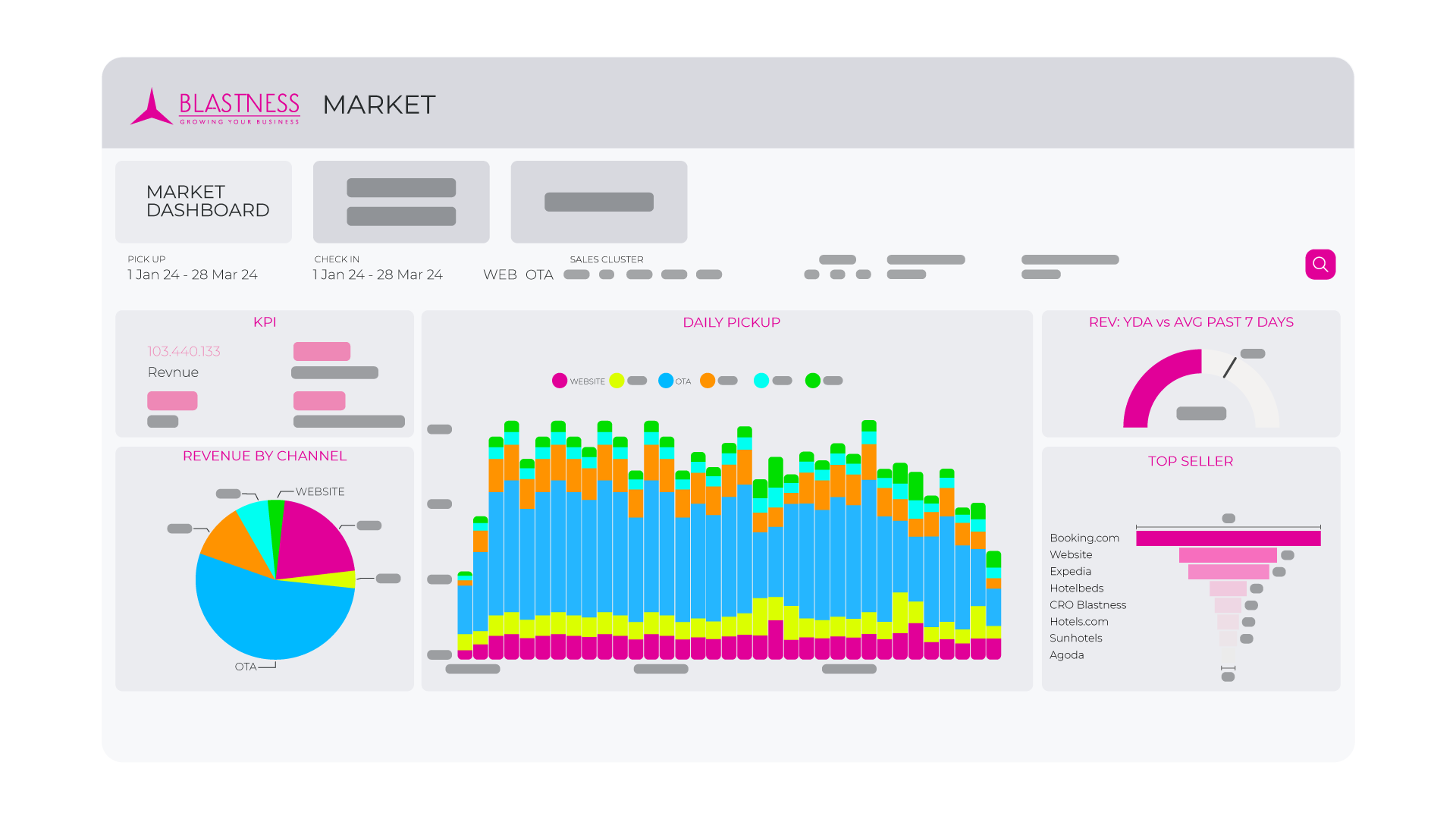 "Stay ahead of competition with Blastness Market Intelligence. Providing real-time analysis of price indexes and saturation levels as well as up-to-date events calendar in an easy-to-read platform, Blastness Market Intelligence enables hotelier to identify the best selling price and boost ADR and RevPAR."