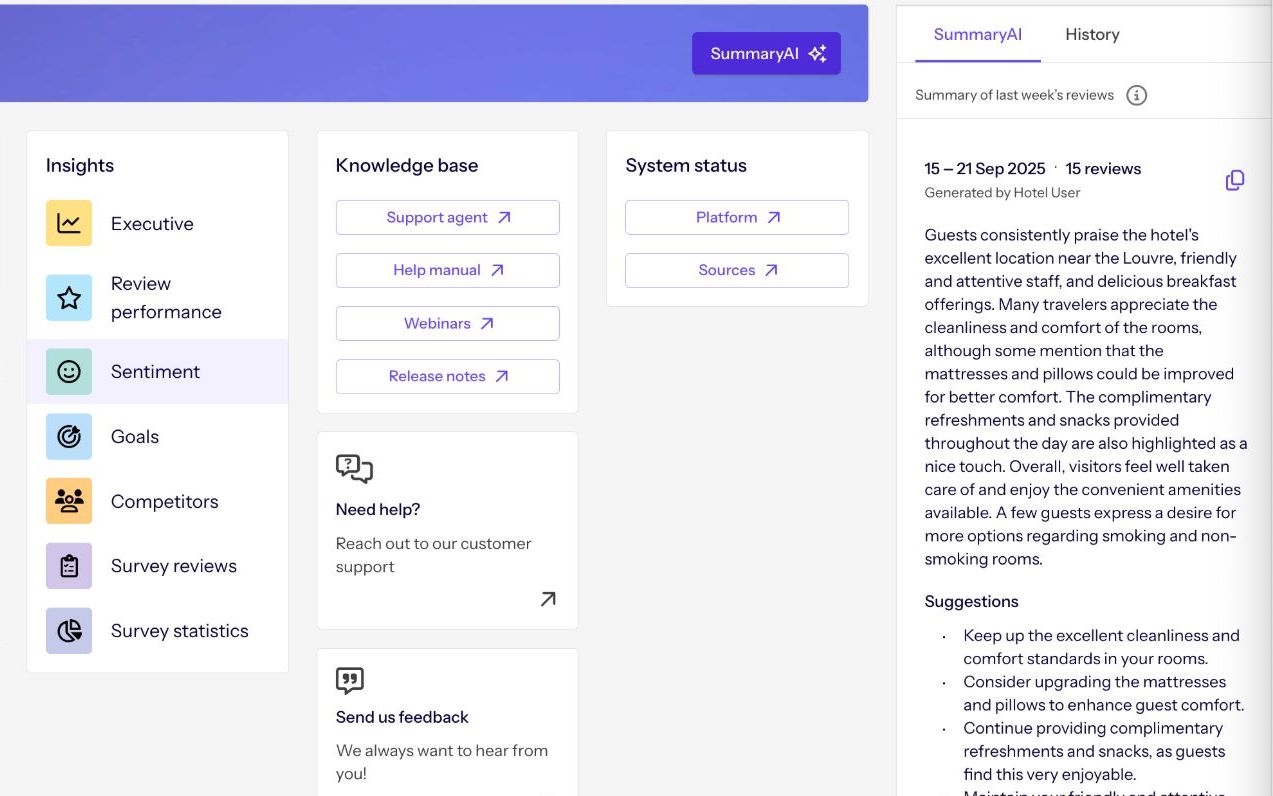 A los hoteleros les gusta que TrustYou ayude a mejorar la satisfacción de los huéspedes y agilizar la gestión de la calidad a través de datos esclarecedores. Centraliza las opiniones de los huéspedes, lo que mejora la experiencia de los huéspedes y permite respuestas rápidas. TrustYou se destaca en el análisis de opiniones, la agregación global de opiniones y el establecimiento de objetivos para la satisfacción de los huéspedes. Sin embargo, las preocupaciones sobre las actualizaciones tardías, la clasificación errónea de opiniones y la accesibilidad a la capacitación son notables. La herramienta puede aumentar significativamente la eficiencia operativa, pero los compradores potenciales deben ser conscientes de sus limitaciones para asegurarse de que satisfaga las necesidades de su propiedad.