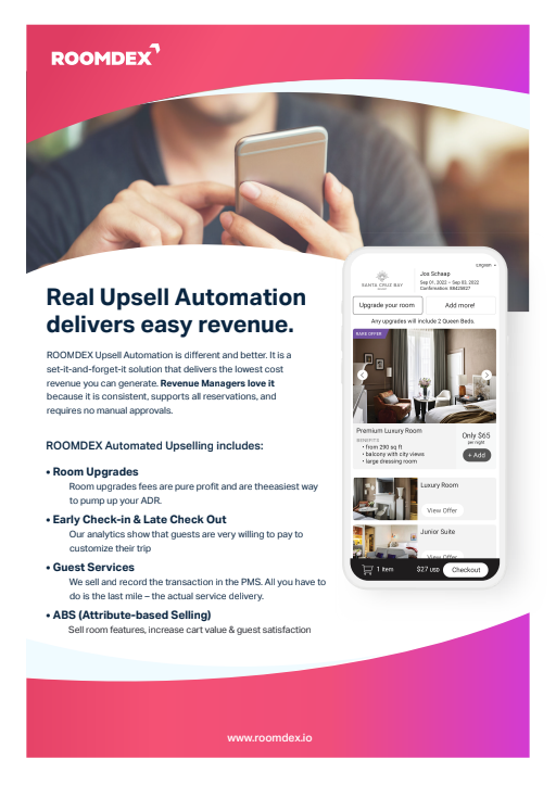 ROOMDEX automatiza, monetiza y, en última instancia, simplifica el proceso de mejora de la habitación del hotel al poner el poder de la elección en las manos de los huéspedes del hotel. La automatización es la piedra angular de nuestra plataforma pionera de optimización hotelera.