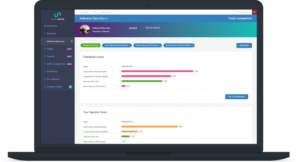 "GIATA DRIVE is a content management tool for hotels to analyse and distribute images, facts and descriptions to OTAs, TOs, bed banks, metasearch engines, etc., incl. Booking.com, Expedia, Google, TripAdvisor. In total 20,000 + distribution channels, online and offline, can access and process the hotel's own content."