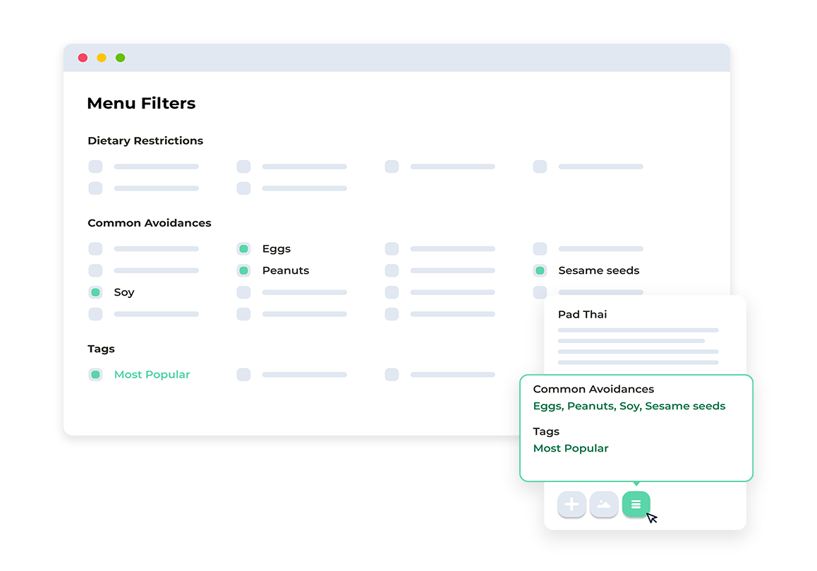 Créez des filtres et des balises personnalisés pour permettre aux planificateurs d'afficher rapidement des éléments de menu spécifiques, tels que des options sans gluten ou végétariennes, et de rechercher des balises spécifiques pertinentes pour vos offres, telles que la saveur locale et plus encore.