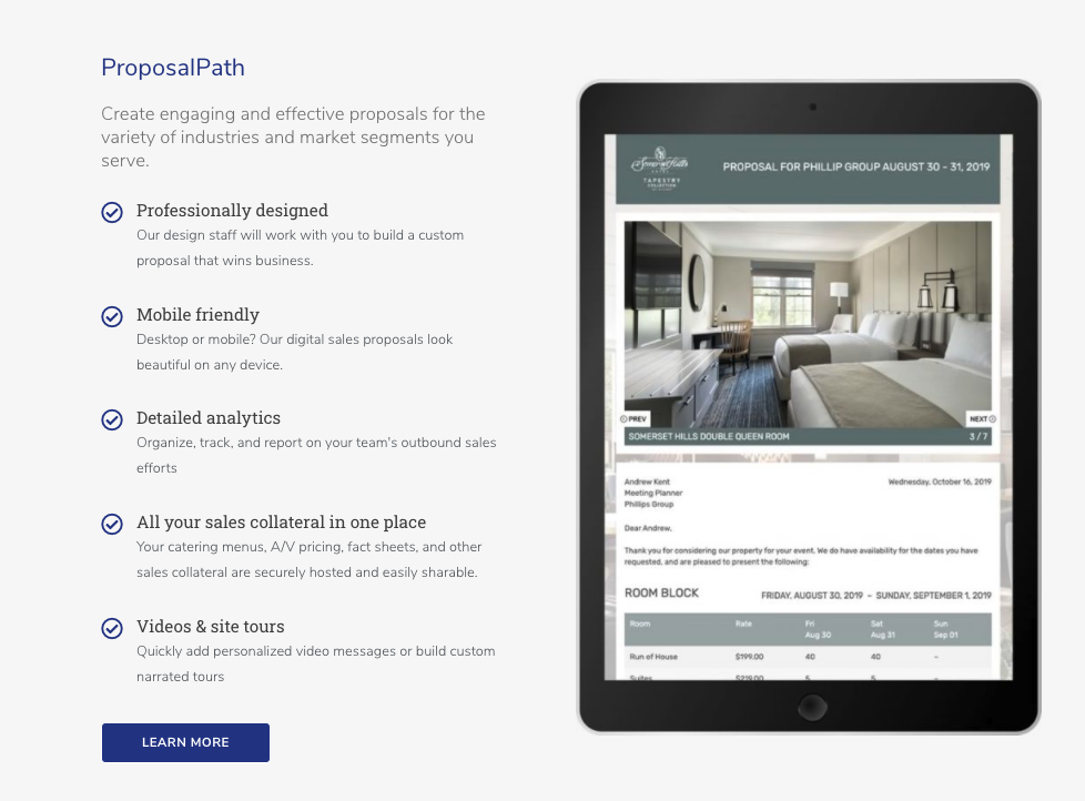 Le puissant flux de travail étape par étape de ProposalPath s'adapte à votre façon de travailler et à celle de votre équipe commerciale. Que vous vendiez un lieu de réunions et d'événements, une destination ou des services d'accueil, nous avons intégré les meilleures pratiques dans ProposalPath pour créer des propositions attrayantes et efficaces pour la variété d'industries et de segments de marché que vous servez.