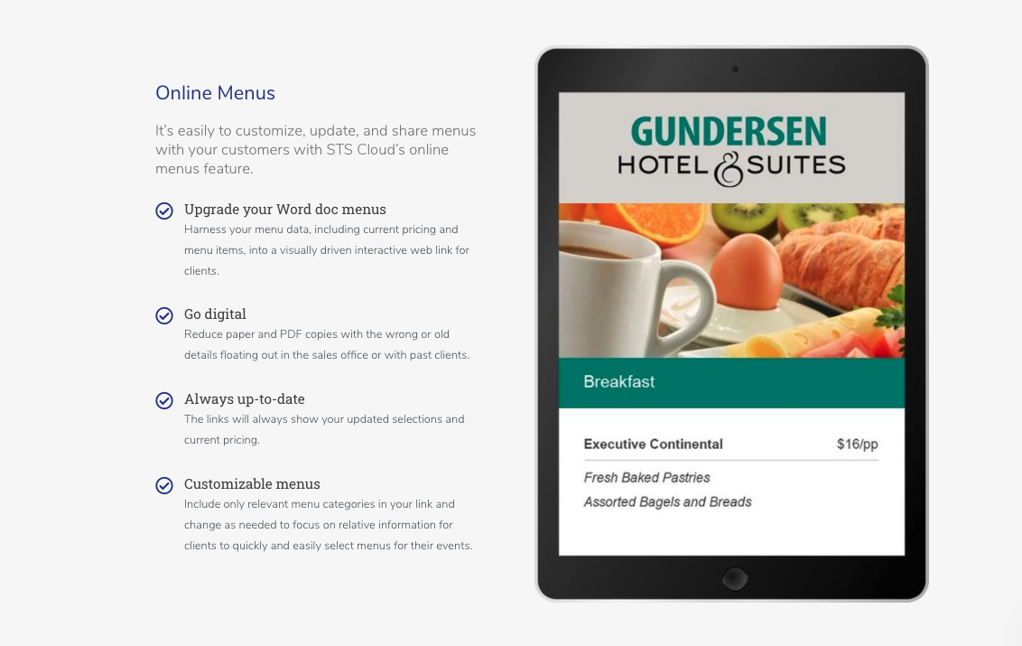 Notre module complémentaire Menus de restauration en ligne apporte la même présentation et le même design que la proposition ProposalPath à vos menus de restauration. Les responsables commerciaux ont la possibilité de sélectionner des menus personnalisés à envoyer aux clients de manière autonome ou entièrement intégrés à l'expérience de proposition.