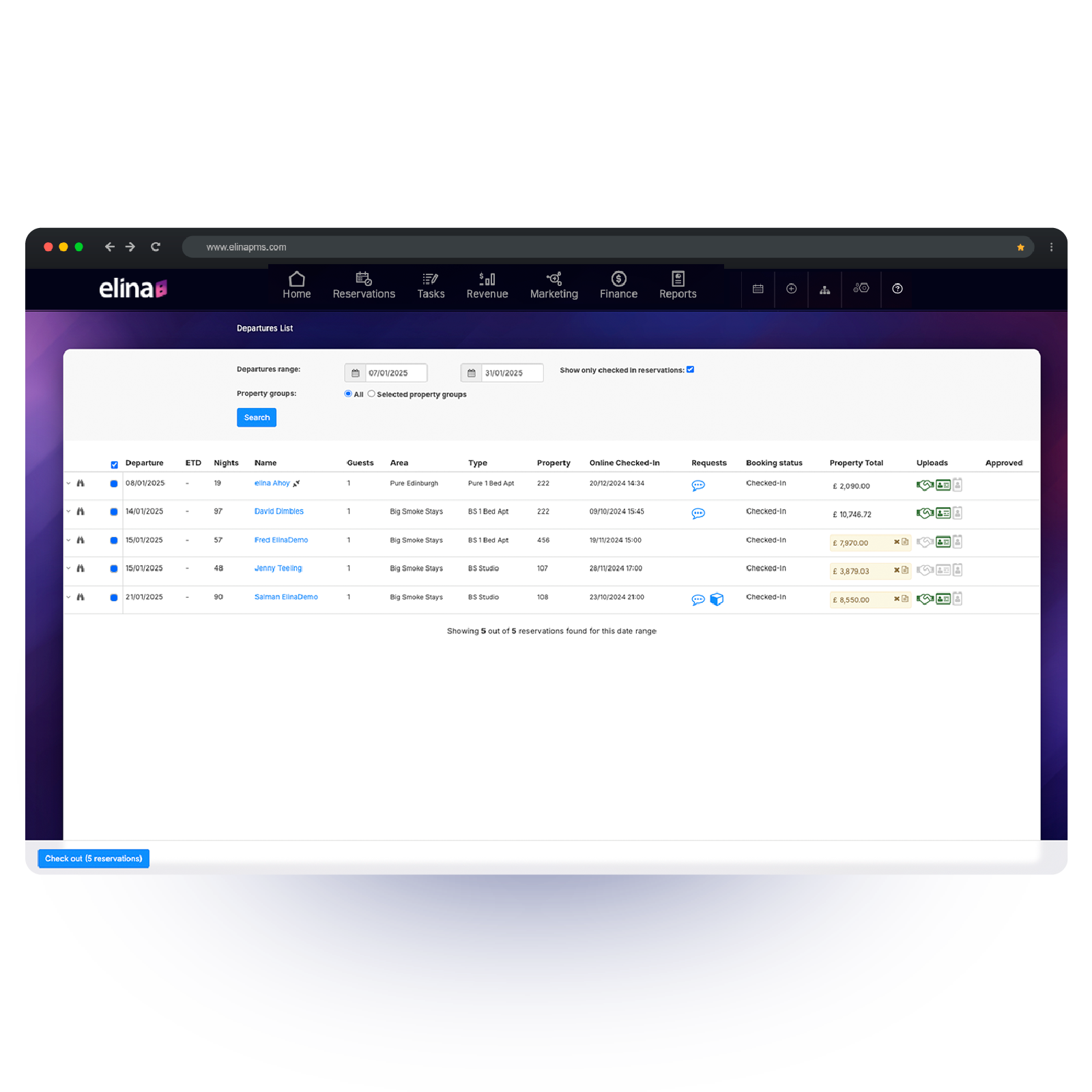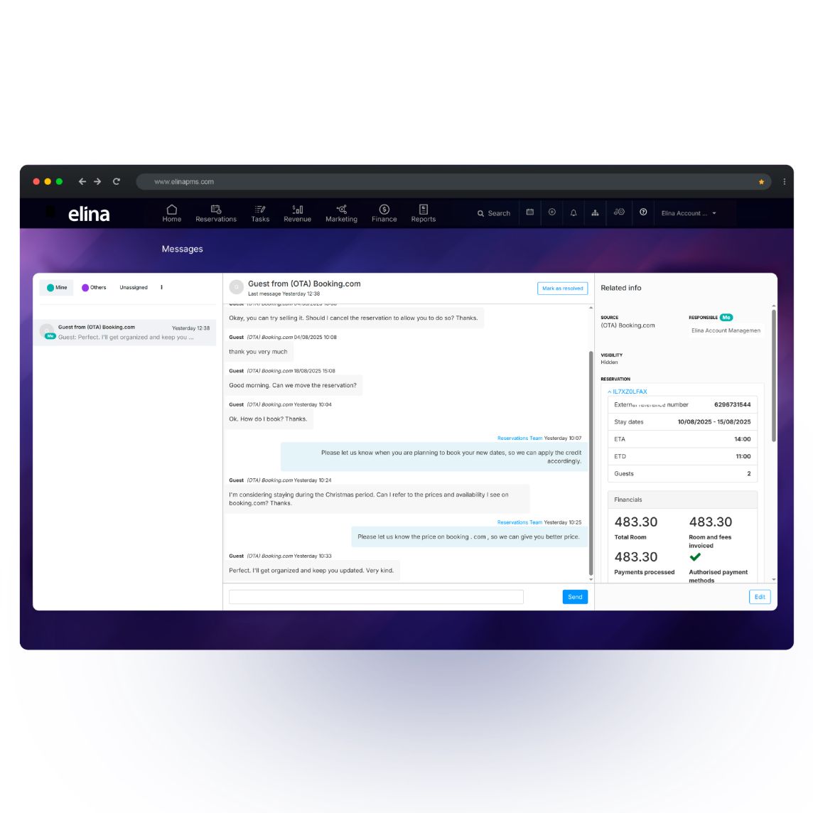 "elina fournit une plate-forme pour gérer vos réservations, vos invités, vos entreprises, vos OTA, vos factures, vos frais et vos rapports, ce qui facilite la croissance ! Un PMS, un gestionnaire de canaux, un moteur de réservation et une connexion invité avec des tableaux de bord en temps réel et des intégrations rapides d'API d'interface bidirectionnelle qui le sous-tendent. Construits avec les réservations directes en leur cœur, les outils d'elina aident les hôtels à attirer et à convertir davantage de réservations directes."