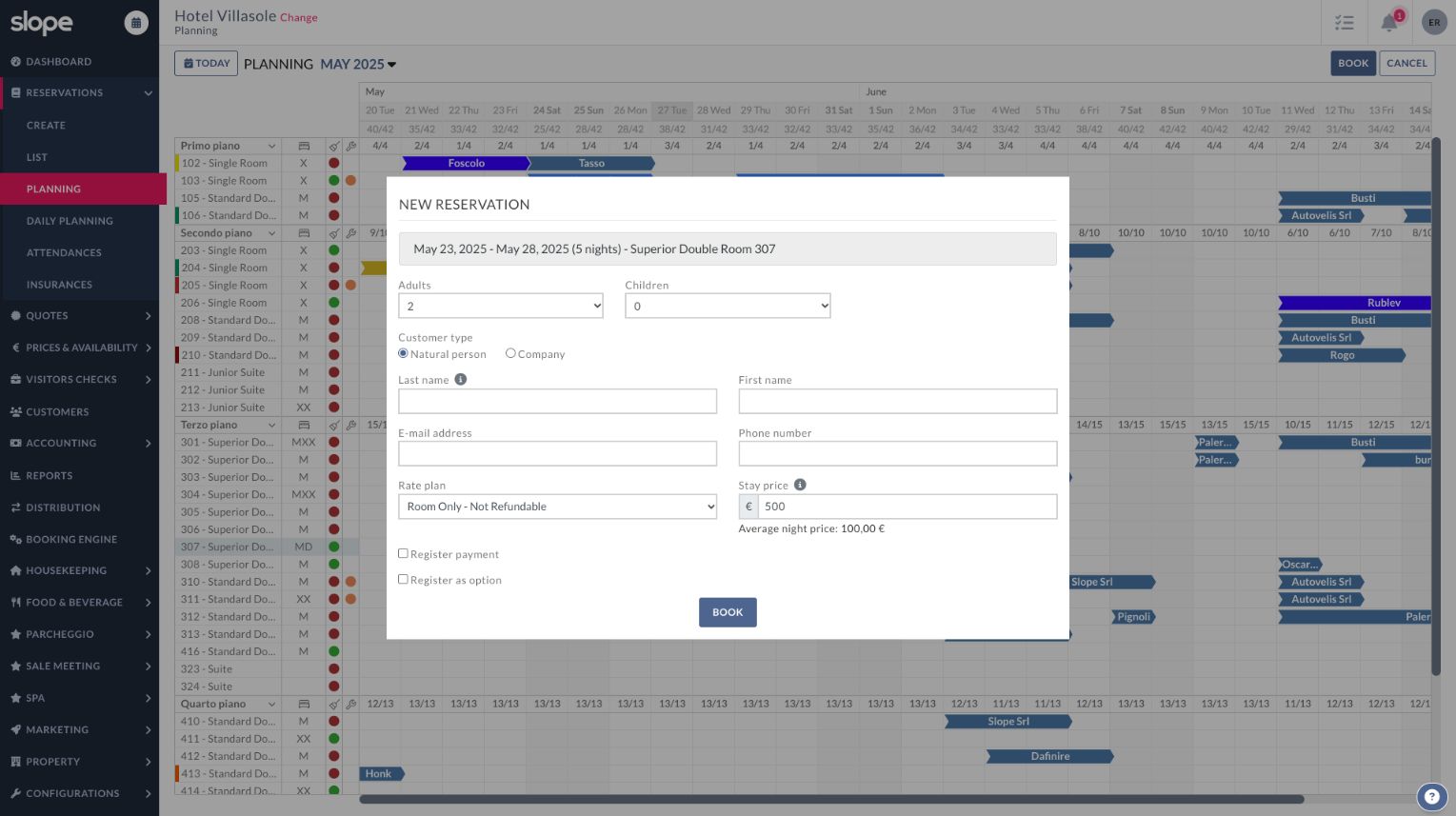 "Slope is an all-in-one cloud management software designed for hotels. Slope includes in a single cloud platform a range of features including PMS, booking engine, channel manager, CRM, sending quotes, RMS, marketing tools, electronic invoicing and telematic payments. Slope is ideal for: - Independent Hotels Slope enables seamless management of every department for operations of any size. This ranges from boutique hotels all the way up to large establishments with hundreds of rooms. -Hotel Groups Features designed to provide easy and comprehensive operational management for hotel chains. This includes group business intelligence, shared guest profiles, multi-account capabilities, and much more - Hotel with restaurant Seamless integration with the Taste Food & Beverage software streamlines workflows between your restaurant and reception areas, making them easy and virtually error-free."