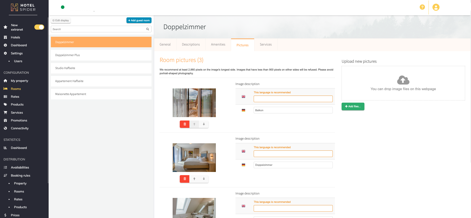 Notre extranet moderne et simple d'utilisation vous offre un accès rapide et efficace pour gérer votre propriété. Changer votre stratégie de vente est facile ; avec un contrôle illimité, vous pouvez adapter l'extranet à vos besoins. Les chambres, les tarifs et les interfaces peuvent être modifiés et les autorisations des utilisateurs définies.