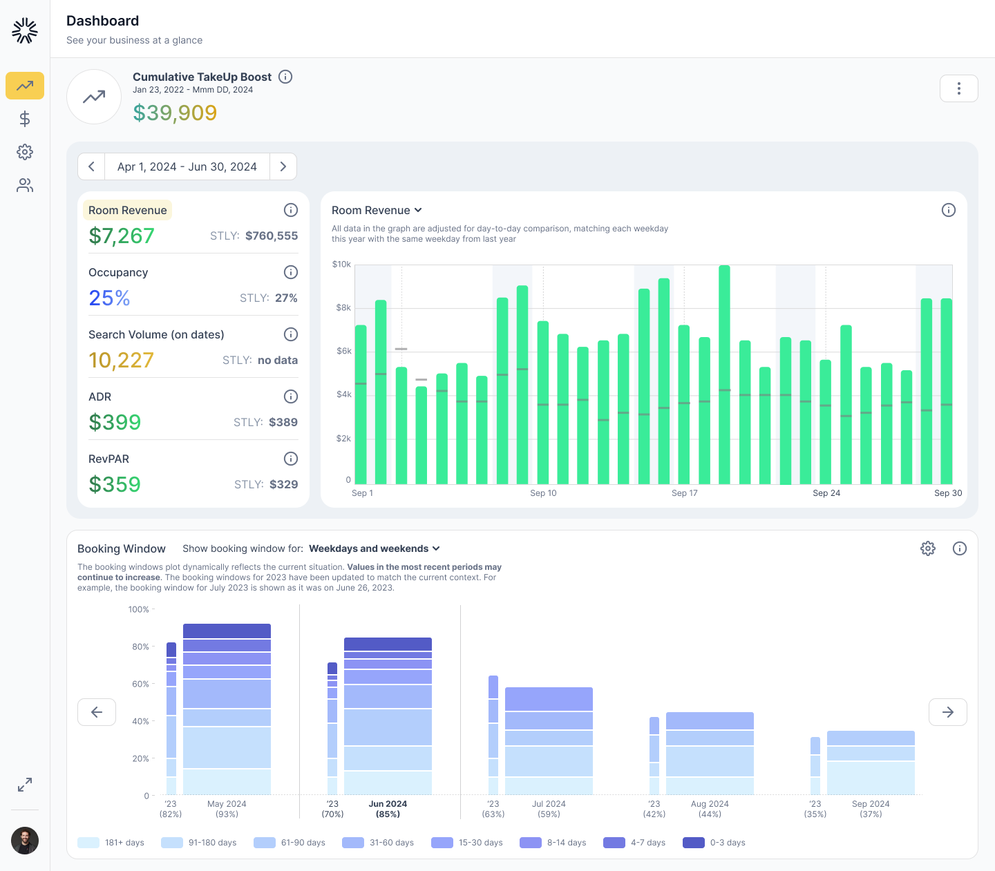 TakeUp uniformise les règles du jeu en proposant une gestion avancée des revenus aux hôtels indépendants. Désormais, même sans comparaison directe, notre modèle analyse vos données et les tendances du marché en temps réel, vous permettant de prendre des décisions de tarification fiables et basées sur les données.