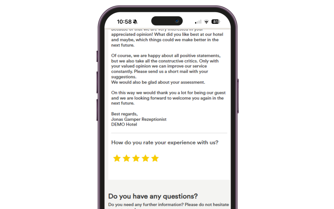 The hotel system impresses with its user-friendly interface, fast chat functions, efficient process support and clear statistics, enabling a smooth and transparent workflow.