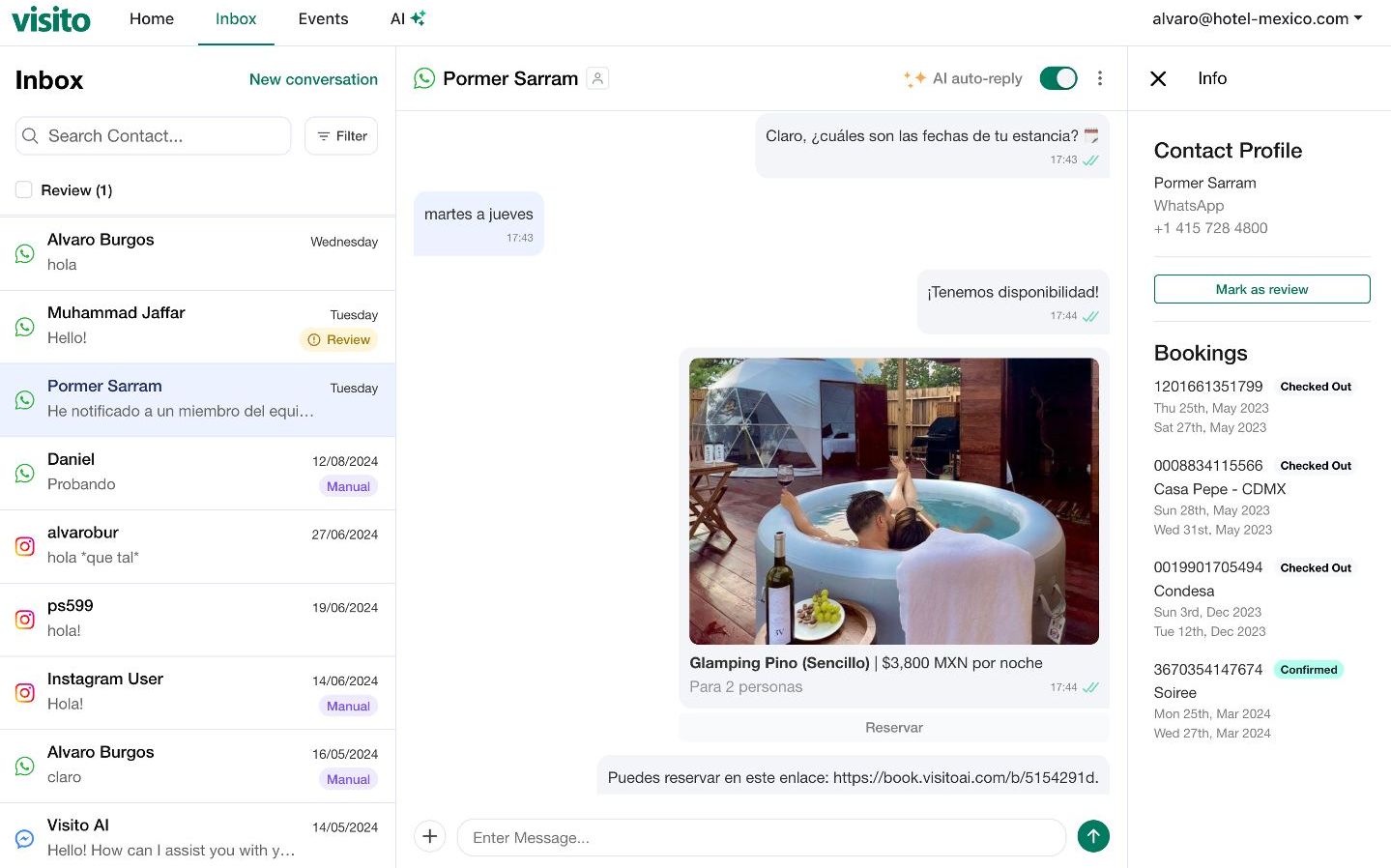" Visito automates guest communications and direct bookings across major messaging channels, including WhatsApp, Instagram, Facebook Messenger, SMS, and live chat on your website. Integrated with leading PMS and booking engines, Visito's AI agents handle common guest questions, real-time availability checks, and end-to-end bookings in 100+ languages, 24/7. Guests get instant support while your team focuses on in-person service. Visito turns your messaging channels into a direct booking machine, while helping you automate 90%+ of support questions. Hotels using Visito see 3x direct booking conversion on messaging channels and can handle far more guest interactions without scaling headcount. Visit www.visitoai.com for more details. "