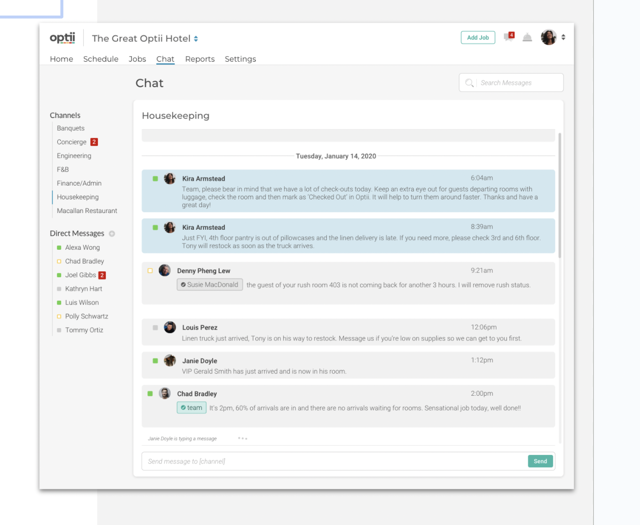 "Optii Chat מאחדים תקשורת בין צוות, מחלקה ומלון כדי למנוע חוסר עקביות, מחסומי שפה וטעויות אנוש. זה מקדם אחריות ומעודד עבודת צוות תוך העצמת קבלת החלטות טובה יותר. Optii Chat מאפשרת לכל המחלקות הפונקציונליות והתפעוליות להישאר מחוברות ומיושרות עם היוזמות והיעדים של המחלקה, המלון והמותג שלהן"