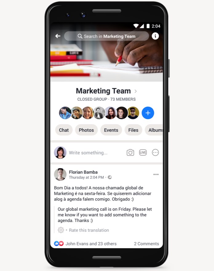 "רוב תוכנות שיתוף הפעולה הופכות לקשות יותר לשימוש ככל שהן הופכות פופולריות יותר - כמו ניסיון לנהל שיחה שקטה בבר צפוף. Workplace משלב את הדחיפות בזמן אמת של הודעות מיידיות עם דיונים מכוונים יותר בקבוצות. אז זה לא נשבר תחת הלחץ של קנה מידה עולמי. - קבל תגובות בזמן אמת ב-Workplace Chat - השתמש בקבוצות פרויקטים לשיחות נחשבות יותר - למידת מכונה פירושה ש-Workplace נעשה חכם ורלוונטי יותר עם הזמן"