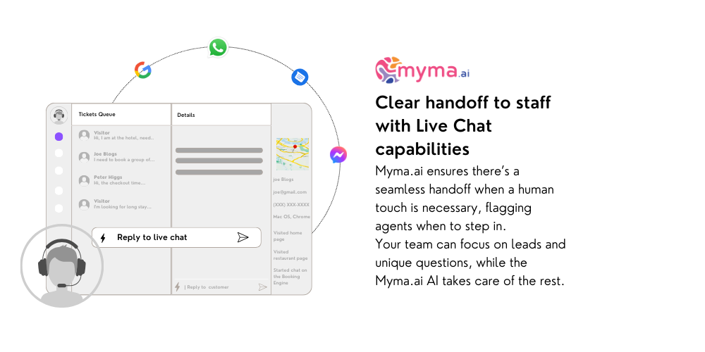 Myma.ai מבטיח שתהיה מסירה חלקה כאשר יש צורך במגע אנושי, מסמן לסוכנים מתי להתערב. הצוות שלך יכול להתמקד בלידים ובשאלות ייחודיות, בעוד שה-Myma.ai AI דואג לכל השאר.