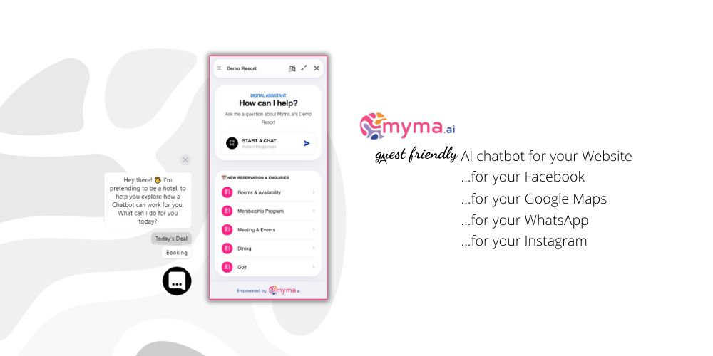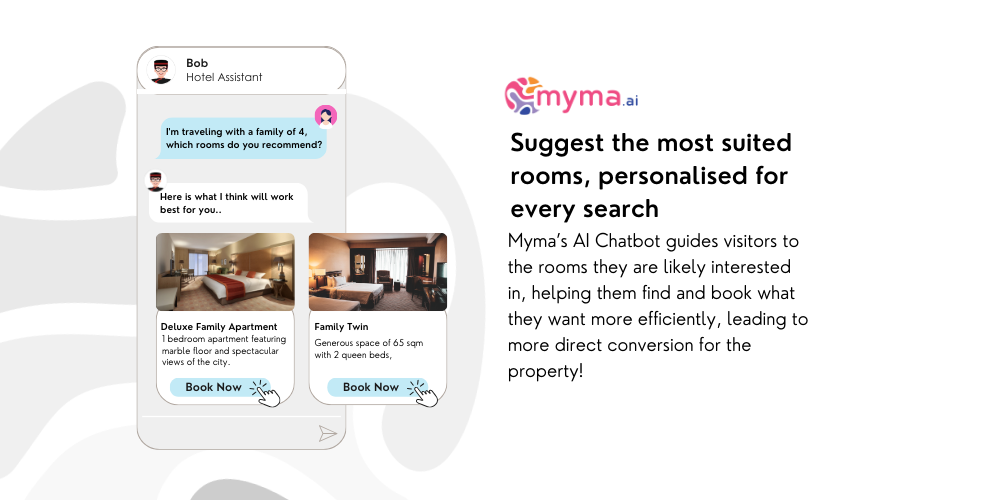 Myma.ai Chatbot מנחה את המבקרים לחדרים שהם כנראה מתעניינים בהם, ועוזר להם למצוא ולהזמין את מה שהם רוצים בצורה יעילה יותר. זה גורם להמרה ישירה יותר עבור הנכס.