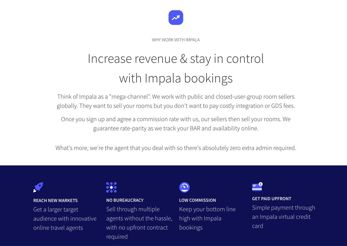 "תחשוב על אימפלה כעל "מגה ערוץ". אנו עובדים עם מוכרי חדרים ציבוריים וסגורים בקבוצות משתמשים ברחבי העולם. הם רוצים למכור את החדרים שלך אבל אתה לא רוצה לשלם שילוב יקר או עמלות GDS. לאחר שנרשמת ותסכים איתנו על שיעור עמלה, המוכרים שלנו מוכרים את החדרים שלך. אנו מבטיחים שוויון תעריפים מכיוון שאנו עוקבים אחר ה-BAR שלך וזמינות באופן מקוון. יתרה מכך, אנחנו הסוכן שאיתו אתה מתמודד, כך שאין צורך בניהול נוסף."