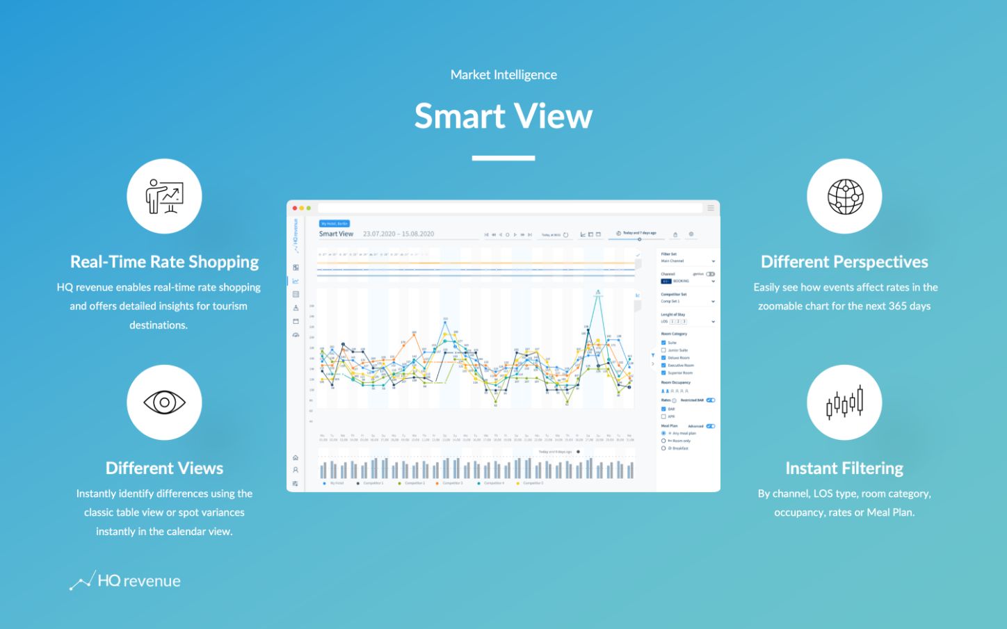 "HQ revenue Market Intelligence היא תוכנת מלונאות מבוססת ענן המעבדת ומדמיינת נתונים מדויקים בזמן אמת על השוק, התחרות והתפעול. אתה יכול לצפות לכלים עוצמתיים ואינטואיטיביים לניהול הכנסות מקצועי. כי אנחנו יודעים שאתה רוצה לקבל החלטות תמחור בטוחות באמת. והשימוש בטכנולוגיה שלנו עוזר לך למכור את המלאי שלך במחיר הנכון בזמן הנכון. הצטרפות להכנסות מטה פירושה שההכנסה שלך תגדל, תראה יותר רווח וקבלת תמורה מוכוונת לקוח לכסף."