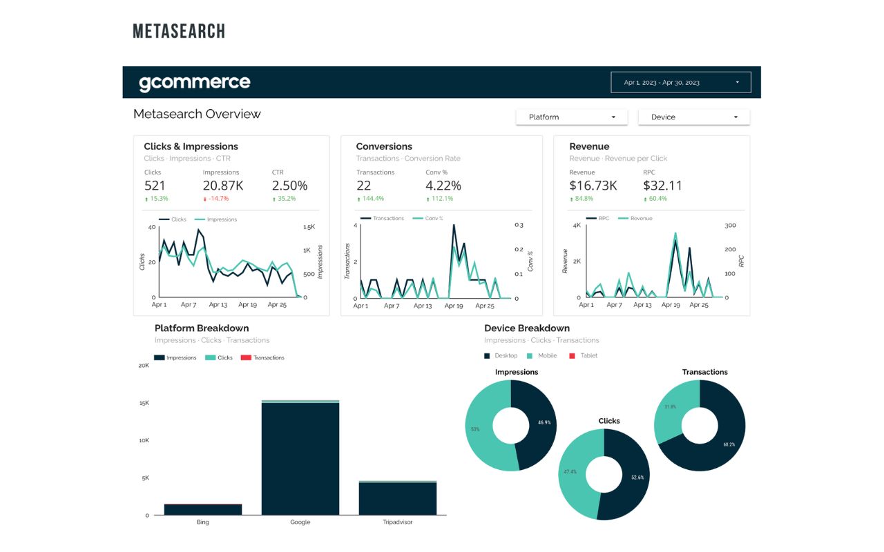 La nostra soluzione pubblicitaria di metasearch, Metadesk, Powered by GCommerce Solutions, fa più che collegare l'inventario del tuo hotel a Google Hotel Ads; include una strategia completa incentrata sull'utilizzo di numerosi canali di metasearch, targeting e strategie di offerta per produrre il miglior ROAS. Il nostro team è composto da esperti di strategia media e gestisce campagne media per l'ospitalità dal 2002.