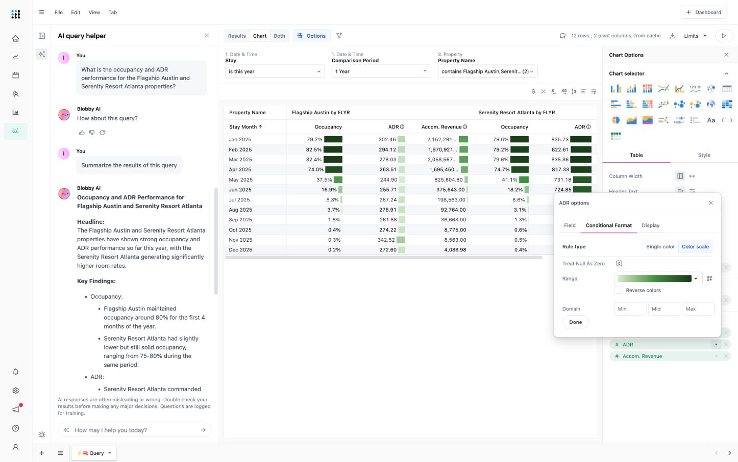 Ottieni risposte senza competenze tecniche. Esplora facilmente dati complessi ponendo domande in linguaggio semplice. Con query in linguaggio naturale basate sull'intelligenza artificiale, il tuo team può recuperare rapidamente informazioni, senza bisogno di competenze SQL o tecniche. Chiedi semplicemente "Qual è stato l'ADR del mese scorso?" e ottieni risultati immediati e accurati.