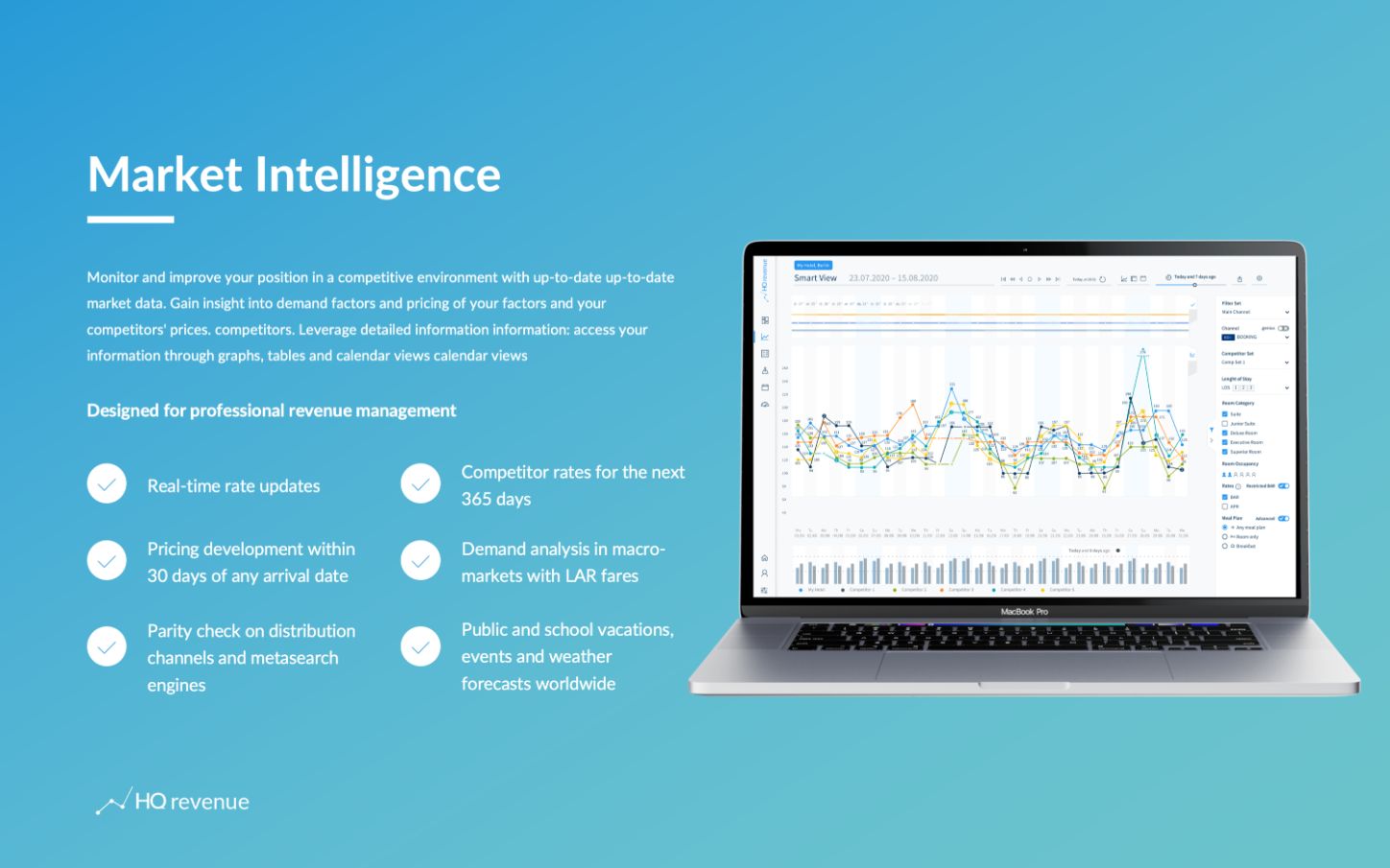 HQ Revenue fornisce uno strumento di intelligence competitiva dettagliato e facile da usare per il settore alberghiero. Consente ai proprietari di hotel di adattare strategicamente le tariffe delle camere in base ai dati di mercato in tempo reale e ai prezzi della concorrenza.