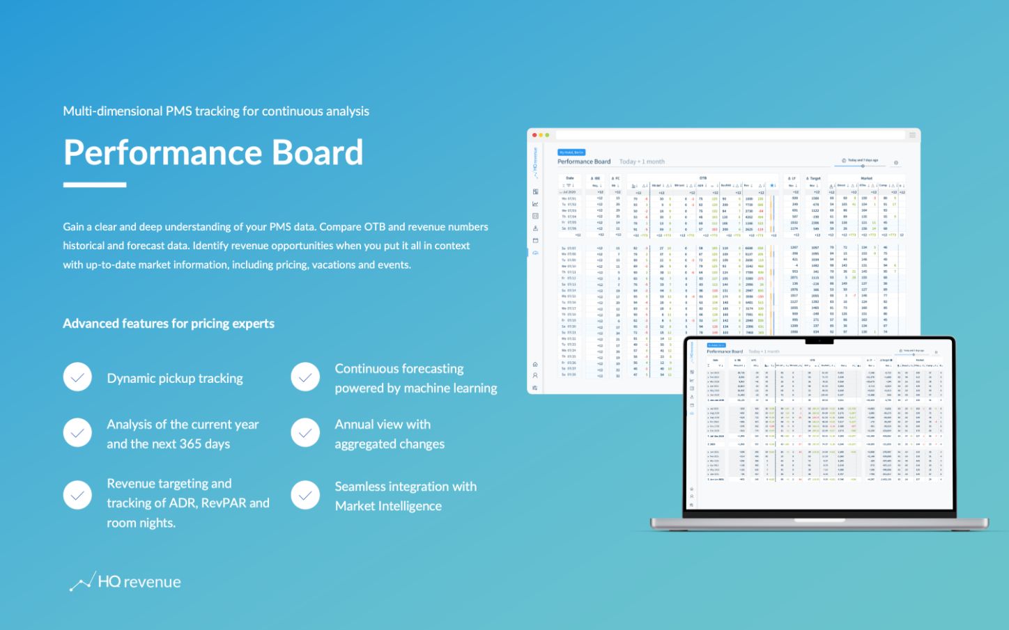 HQ Revenue offre una panoramica completa delle tariffe delle camere rispetto alla concorrenza per un periodo prolungato (fino a 365 giorni). Il team è fantastico con una vasta conoscenza nel settore alberghiero e un eccellente team tecnico.