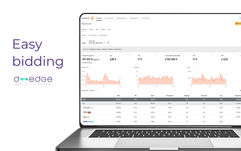 "MediaGenius by D-EDGE helps your hotel stand out on leading search, metasearch and display ads platforms like Google Hotel Ads, TripAdvisor, and Trivago. This centralised platform simplifies digital marketing campaign management, driving direct bookings while maximising your visibility and reach in a highly competitive landscape."