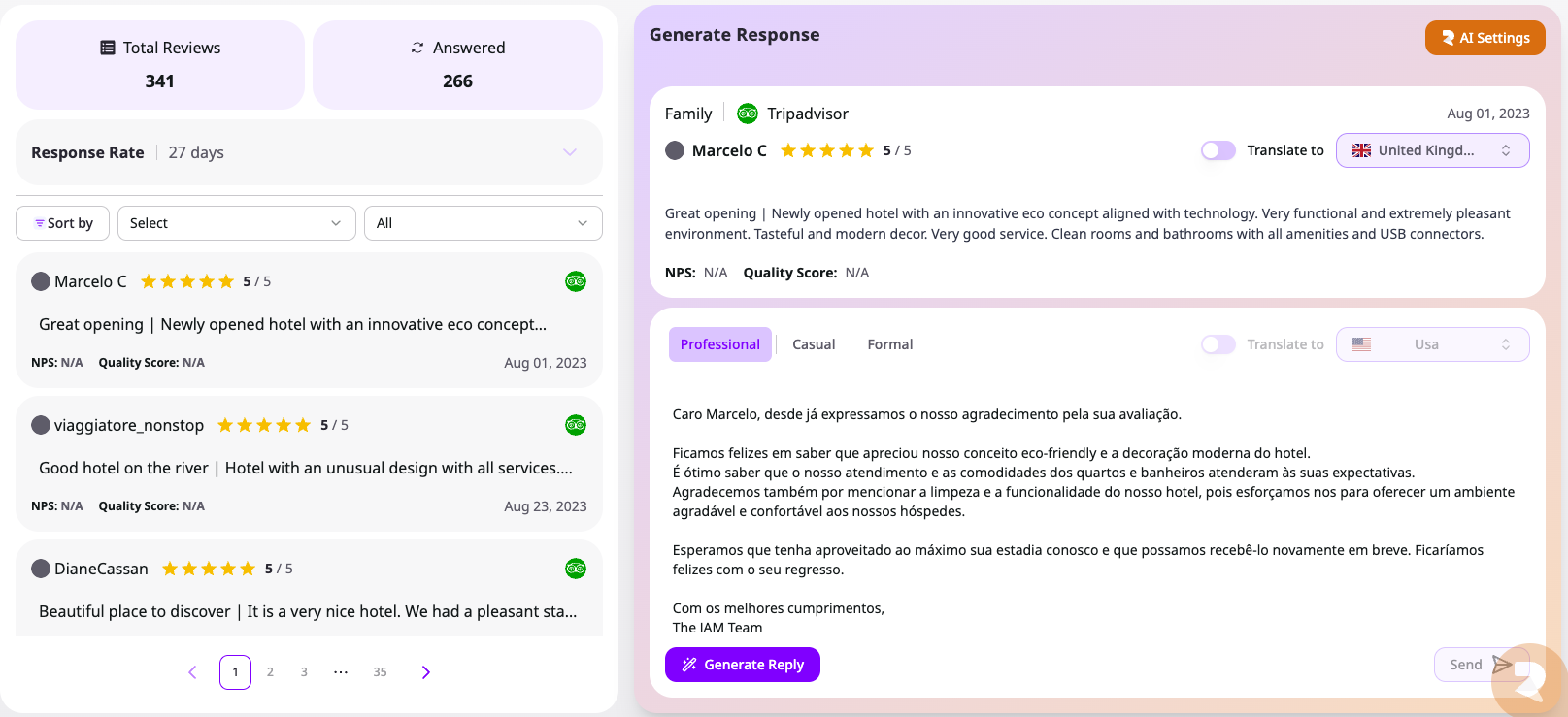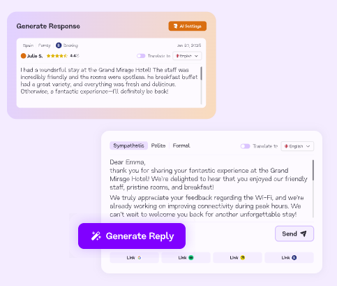 Amazing AI functionalities to quickly reply to a review, not loose track of any negative reviews and our online reputation, close the feedback loop with the responsible departments, and also quickly collect positive public reviews.
