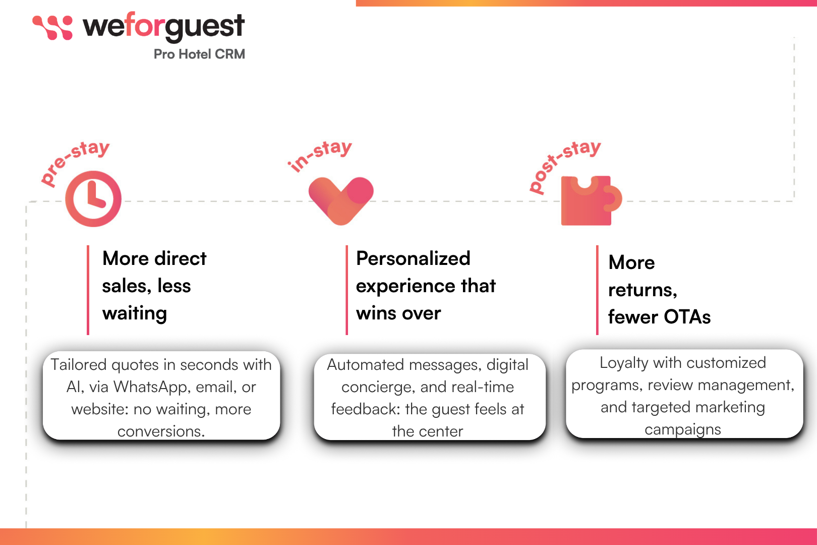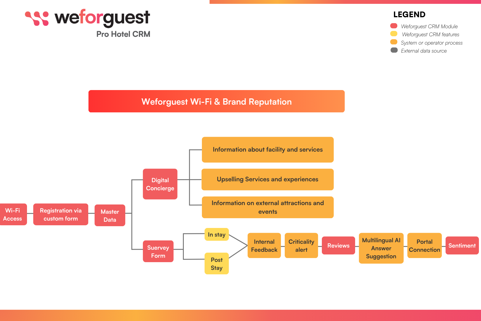 This description was generated by AI which analyzed the following sources to summarize a description of Weforguest CRM products, features and capabilities. Leveraging user generated verified data sources allows us to generate a more helpful and realistic description for hoteliers free of sales promotion and hyperbole.
