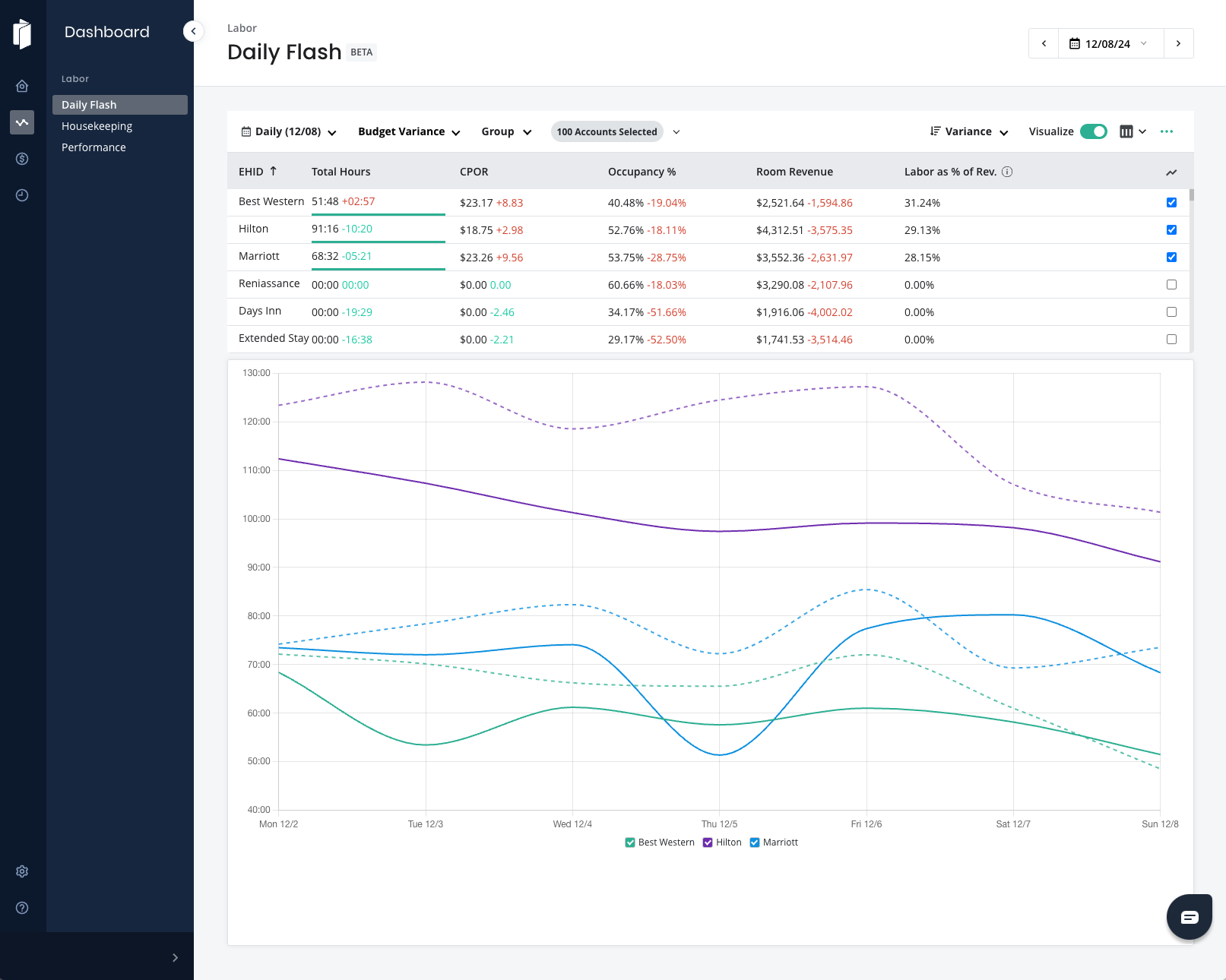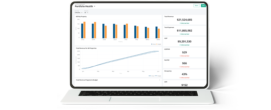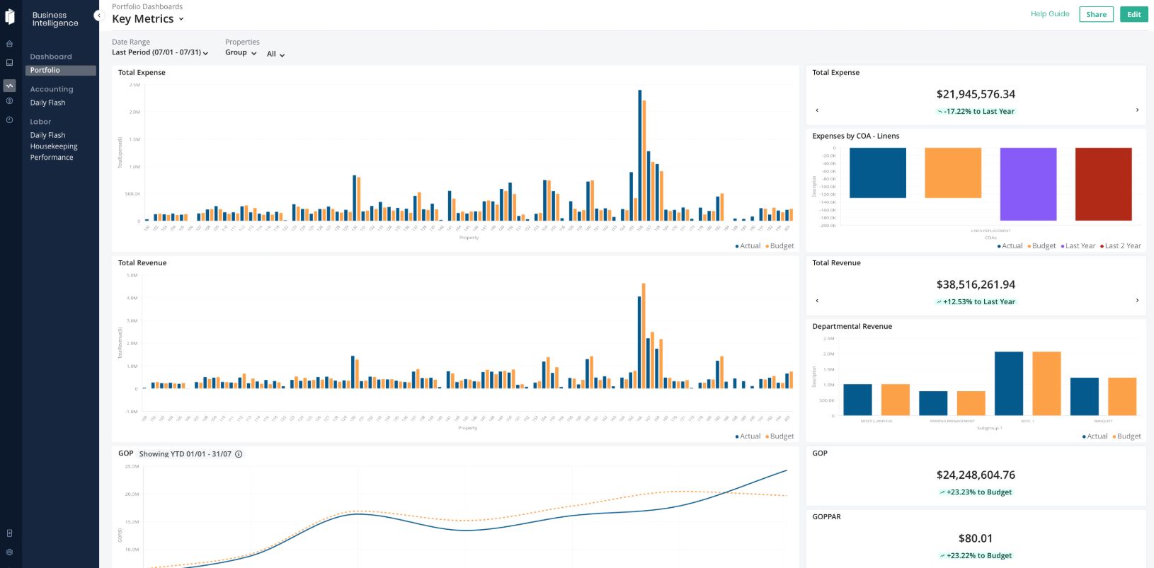 Houd hotelspecifieke Key Performance Indicators (KPI's) bij, zoals RevPAR, CPOR, MPCR en het percentage arbeid in de omzet. Vergelijk de werkelijke cijfers eenvoudig met het budget, vorig jaar of de afgelopen twee jaar, en voer benchmarking uit tussen merken, markten en accommodatietypen voor contextuele prestatieoptimalisatie.