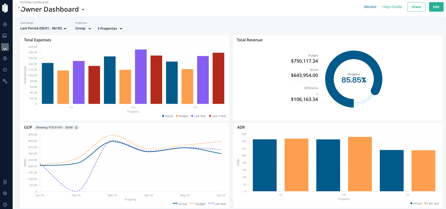 Creëer gepersonaliseerde dashboards met flexibele drag-and-dropfunctionaliteit om belangrijke prestatiegegevens te visualiseren via interactieve grafieken en diagrammen. Gebruik samengestelde sjablonen of voeg snel metrische kaarten toe voor KPI's zoals het gemiddelde dagtarief (ADR) en de bruto-exploitatiewinst (GOP). Zoom in op COA-niveau voor gedetailleerde inzichten in uitgaven en inkomstenstromen.