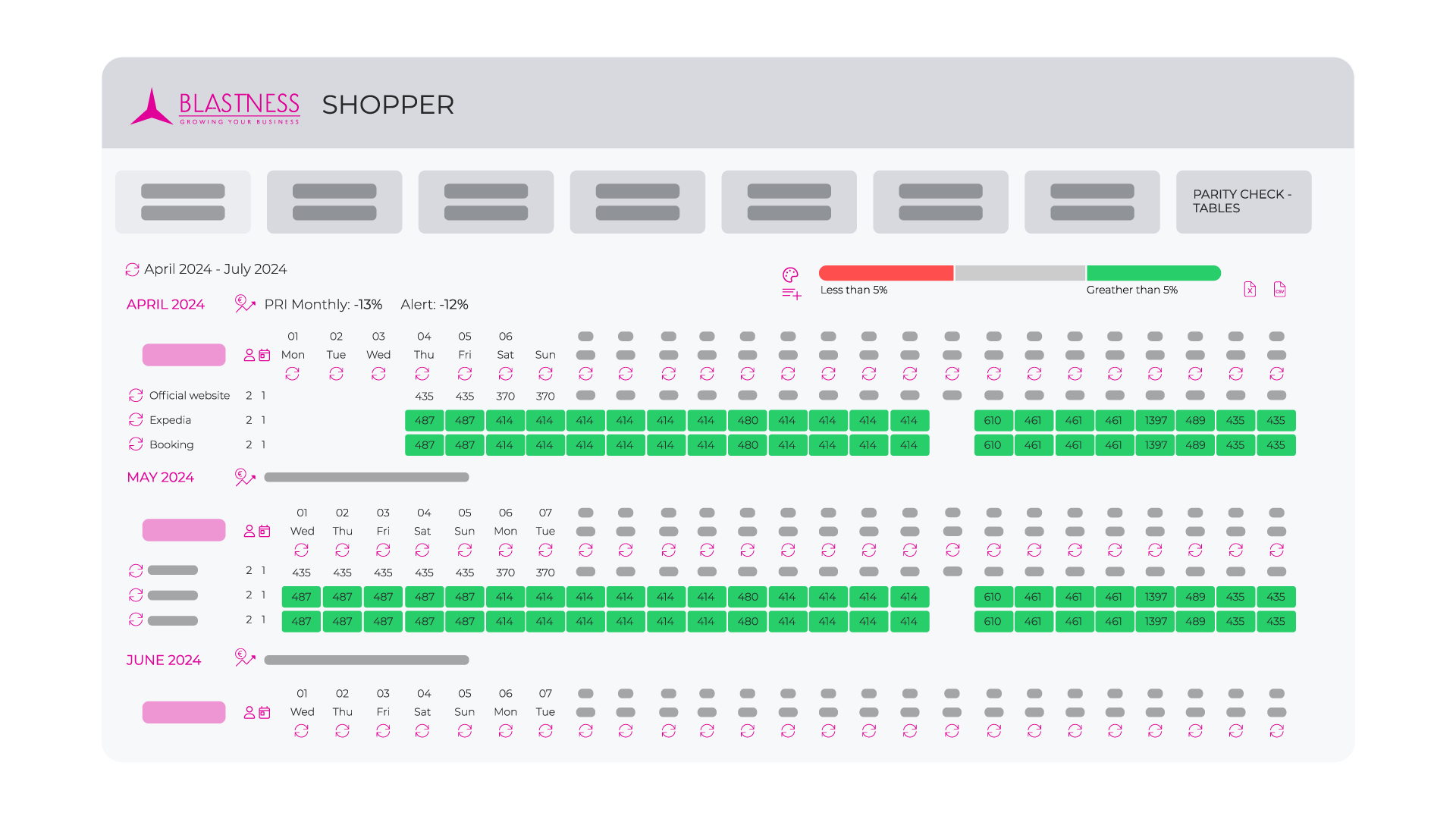 "Elevate your pricing strategy with our cutting-edge tools designed to keep you ahead in the competitive hospitality market with our Rate Shopper + Parity Check solution. The Rate Evolution feature offers unparalleled insight into rate fluctuations, allowing you to analyse changes not only for your hotel but also for your competitors. Whether you're examining rates for a single date or planning ahead up to 90 days, this tool equips you with the data you need to make informed pricing decisions. Meanwhile, the Parity Check function serves as a proactive measure against pricing disparities that could potentially disadvantage your direct booking channels. By monitoring your official website's rates against those of the leading OTAs on a day-to-day basis, you can ensure parity and safeguard your position on price comparison platforms like Google Hotel Ads."