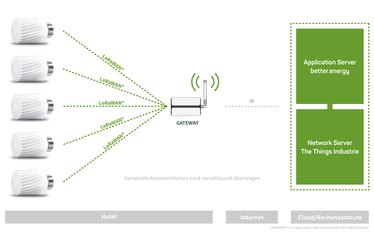 "better.energy regulates the temperature in hotels automatically and depending on occupancy. Thanks to an interface to the PMS, the software knows which rooms are occupied and detects open windows, so better.energy automatically adjusts the heating output, thus reducing energy consumption by up to 30 percent. The smart radiator thermostats are connected to the better.energy energy management system via LoRa, the modern radio technology. Without structural measures and cables, the system is quickly and easily implemented in your hotel."