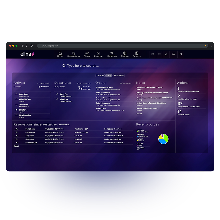 "Elina PMS - cloud based smarter property management software for managing reservations, payments, guests, companies, OTAs, billing, and reporting in one system, with friendly customer service, in-software helpdesk and APIs. Choose the elements you want: PMS, channel management, booking engine, website, online check-in and payments. We excel at helping hotels in increasing direct bookings, getting to know their guests better to personalise their stay, automating tasks to save time, reducing costs on payments and providing data to help with decision making."