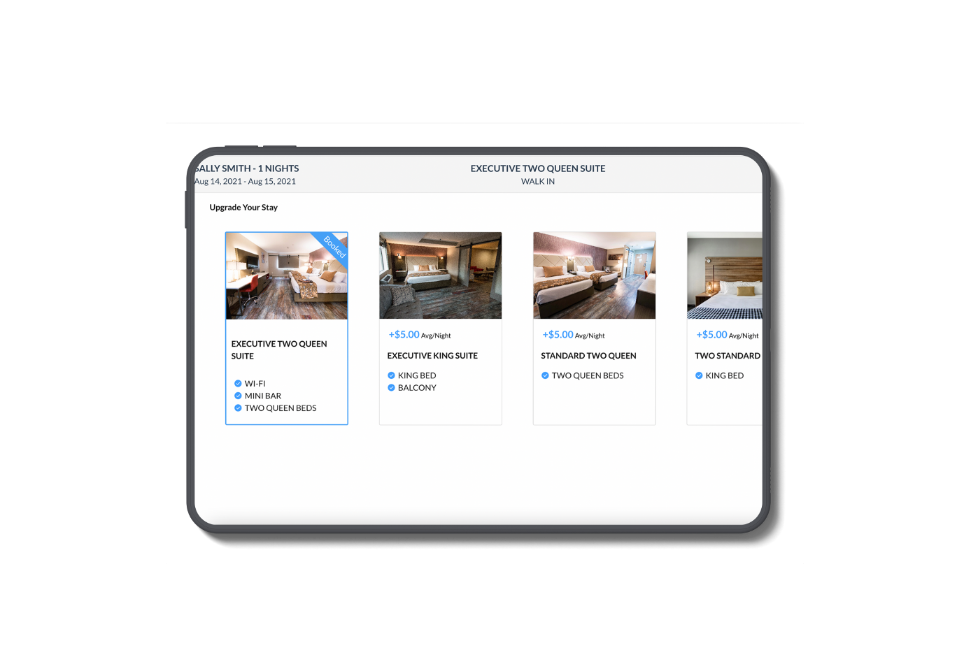 Utilize um tablet voltado para os hóspedes na recepção e permita que os hóspedes controlem o check-in. O GuestPad permite que os hóspedes atualizem seus quartos, selecionem complementos para melhorar sua estadia, escolham o quarto desejado com base na planta de sua propriedade e assinem o cartão de registro na tela.