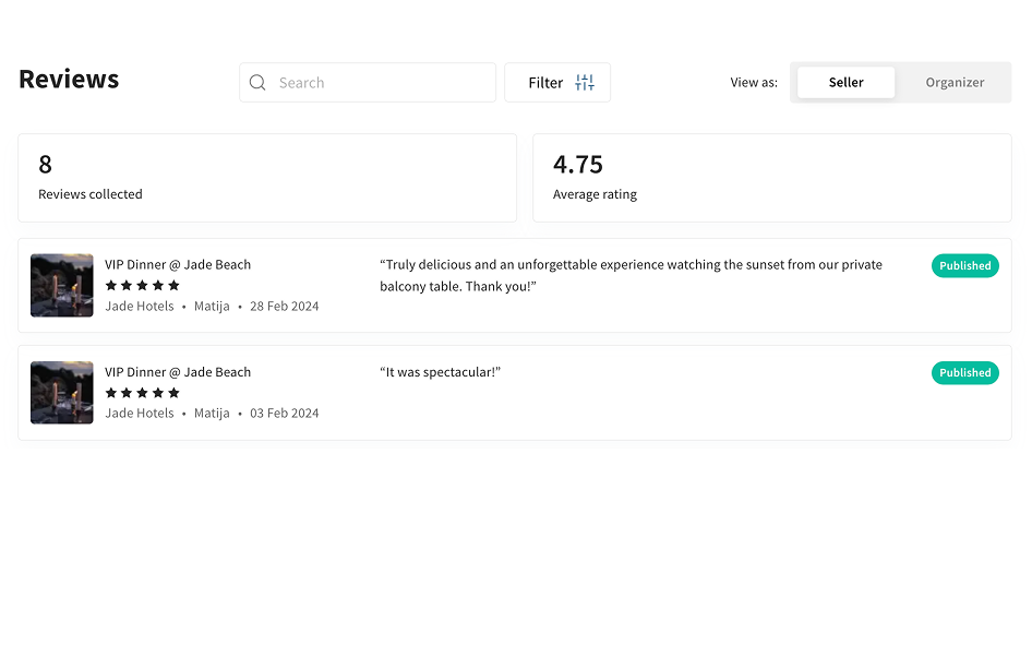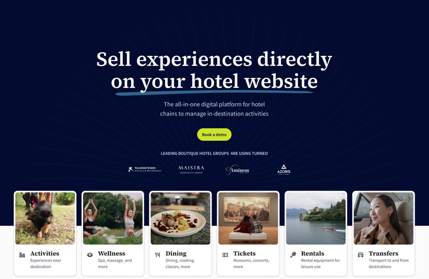 "Turneo's platform enables hotels to sell in-destination activities directly on the hotel's website. It supports both in-house and external activities, including tours, spa&wellness, dining, event tickets, transfers and rentals. The booking engine is integrated as a white-label solution without any third-party branding. Turneo platform acts as a single source of truth for experience management and can be used to centralize online and on-property bookings coming from the concierge, reception desk or other guest touchpoints within the hotel."