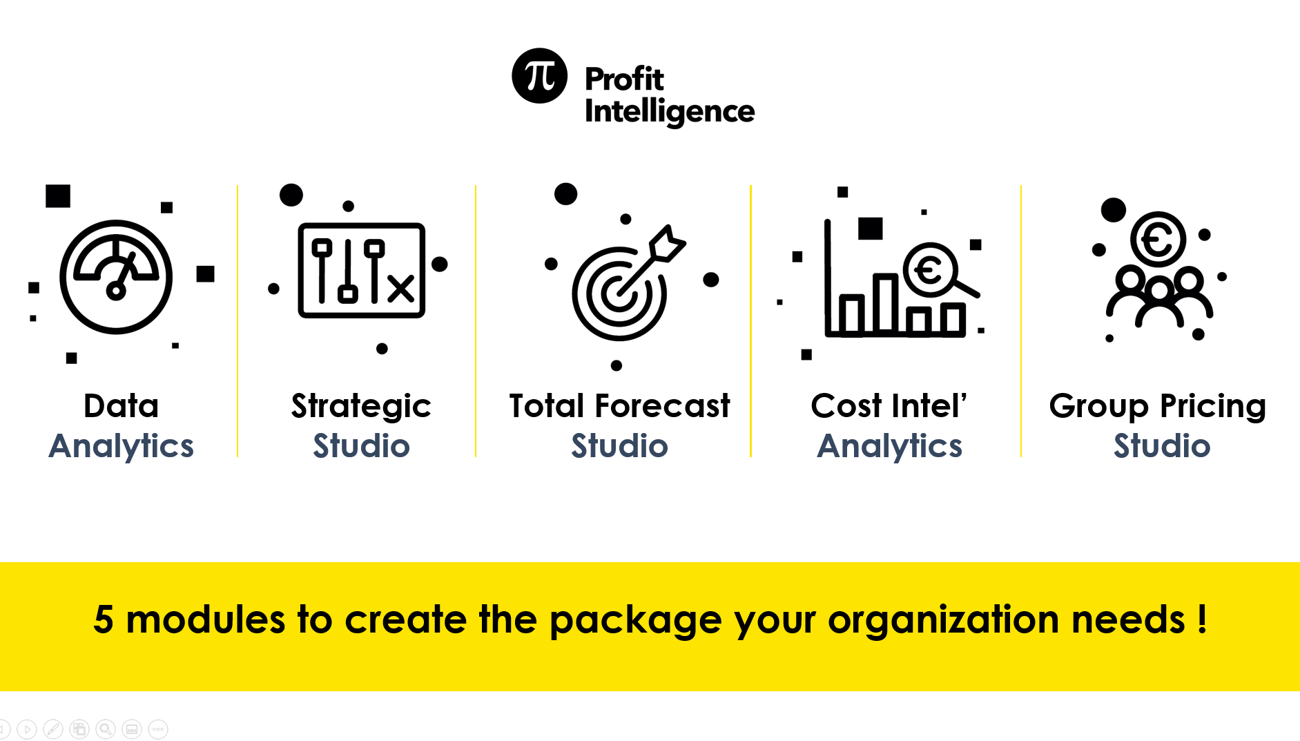 "Profit Intelligence transforms hotels, hostels, aparthotels… data into higher profits. Portfolio consolidation, Customizable dashboards and KPIs, True net rate and costs analytics, Revenue and yield management, Forecasting & budgeting, Groups and M&E quotations Our intuitive online set of solutions empower hoteliers to make strategic decisions that optimize revenue and profits."