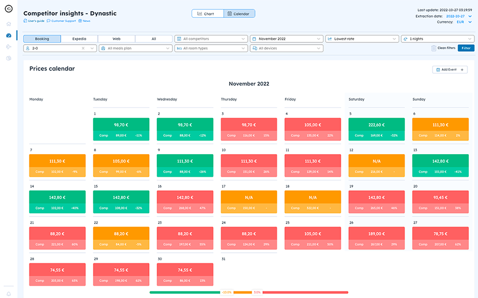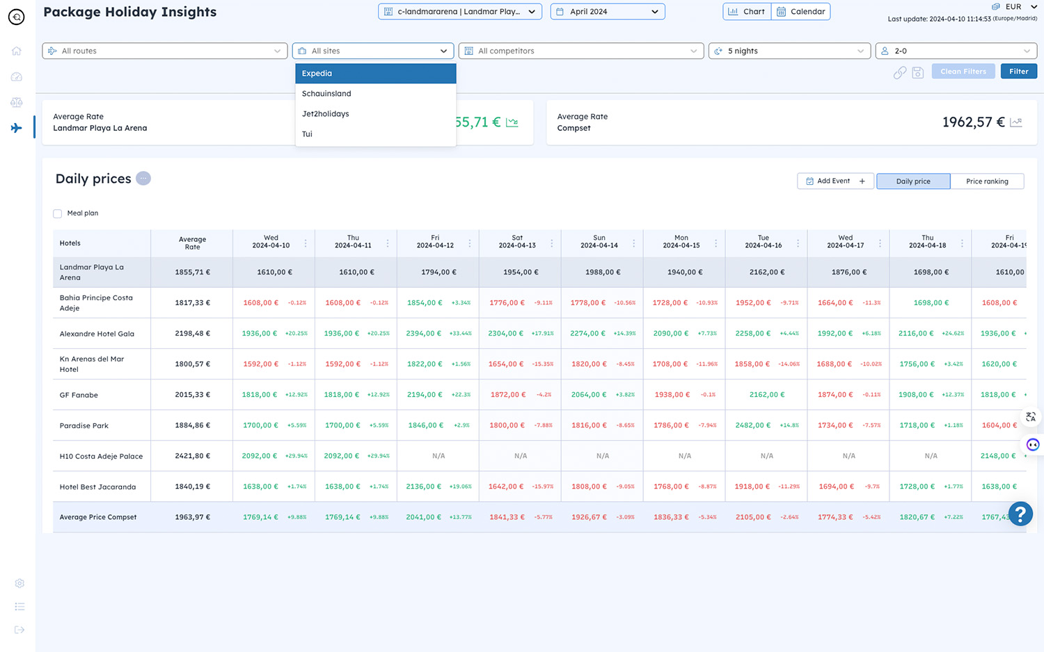 "Price Seeker is a rate shopper tool that allows you to automate price searches in real time, with the double aim of controlling hotels distribution and analyze our competitors. We monitor more than 200 sites, including package rates and touroperators, where we focus on those with higher market share in your hotel or provide the most qualified traffic. In addition, our service is complemented by offering a greater context on each price, and with the unconditional support of a team trained in the tourism sector, capable of helping hoteliers to face and overcome their daily challenges, and of helping those companies that require customized developments, among many other advantages. All this will allow you to make better decisions in terms of pricing, hotel distribution and Revenue Management and, as a result, will also lead you to obtain better results."