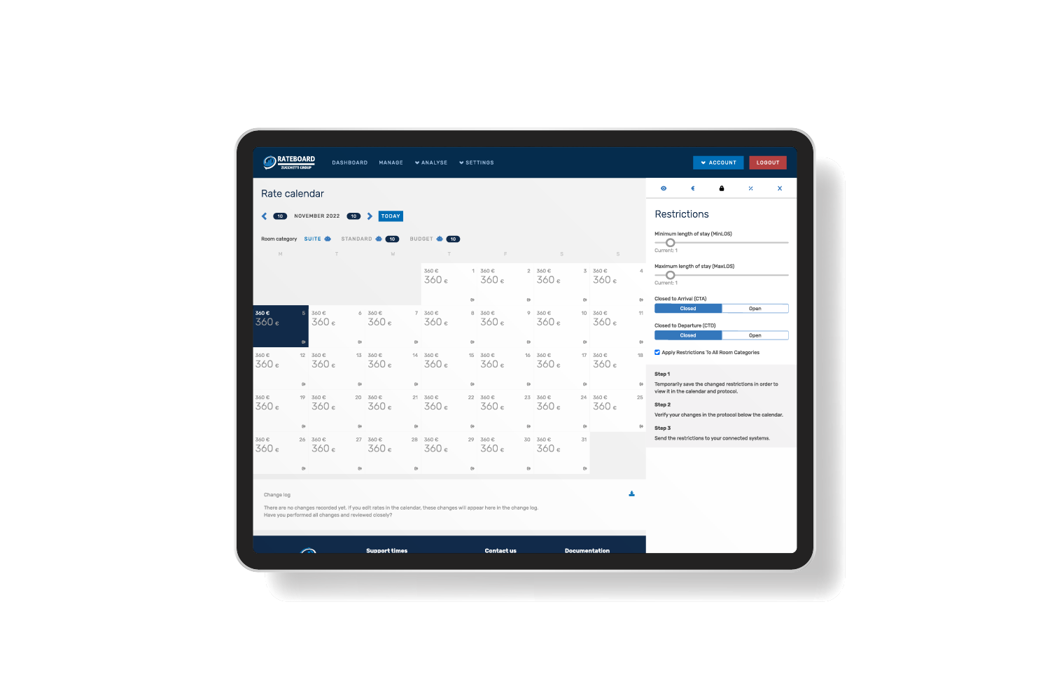 Rateboard is a great and easy system to help hoteliers with automating their pricing strategy without taking up a lot of time for the user. Pricing suggestion that are provided by Rateboard can be easily accepted and adjusted and the system will look out for unusual changes and deviations so problems can be solved quickly before the bottom line is affected and rates can be optimised for an increase of revenue on a continuous basis.