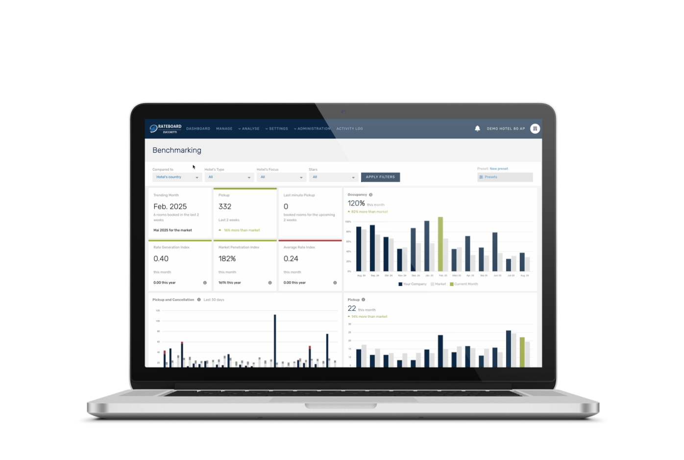 Through years of experience working with hotels across Europe, Rateboard has become the leading revenue management system for leisure hotels in the industry. By ingesting the right internal and external data sources that are important for these properties, Rateboard can help leisure hotels optimise rates for the timeframes that matter the most to each individual property. By clustering dates that show similar performance and forecasting potential cancellations, Rateboard always stays up to date and can react to more dynamic markets outside of the classical seasons.