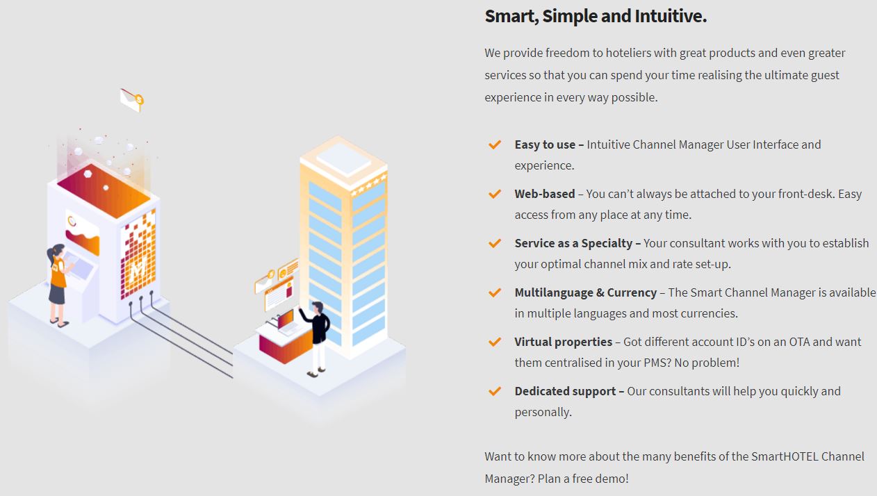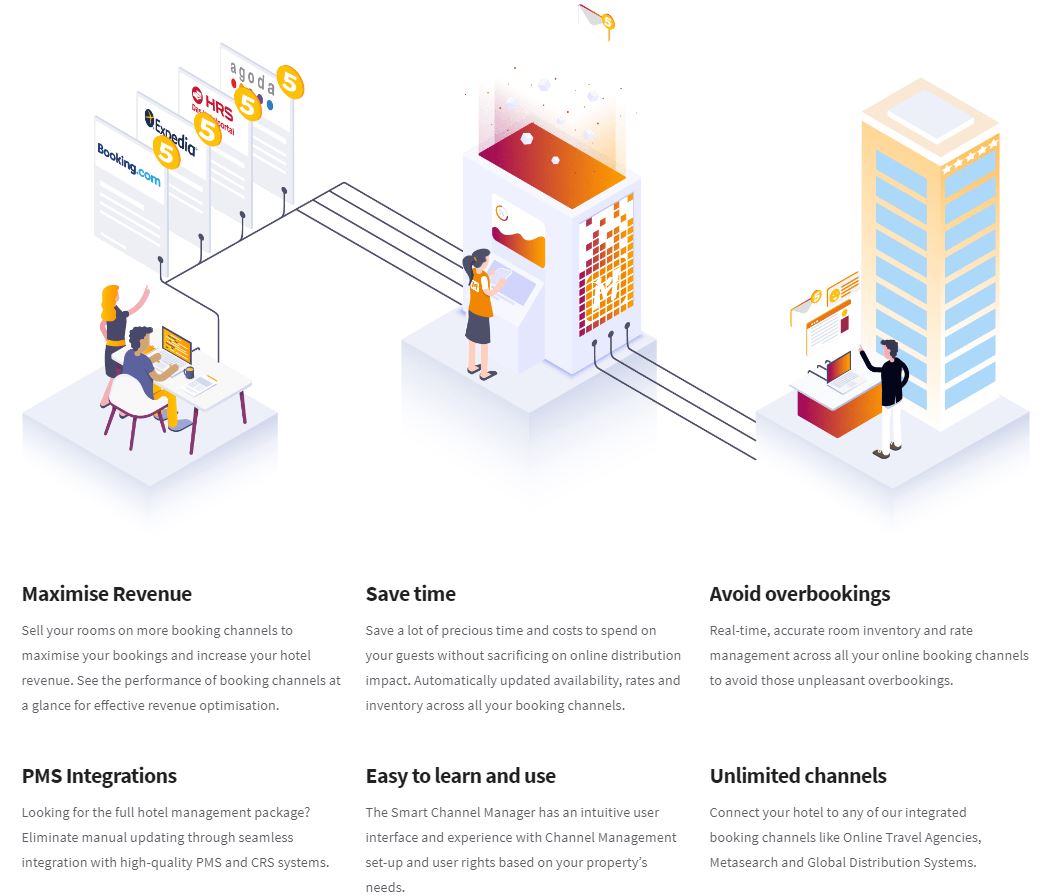 "为酒店经营者提供自由您的时间非常宝贵,应该致力于优化您的客人体验。避免超额预订、耗时的手动渠道管理、错误和错失机会。使用 SmartHOTEL 渠道管理器增加您的在线预订。"
