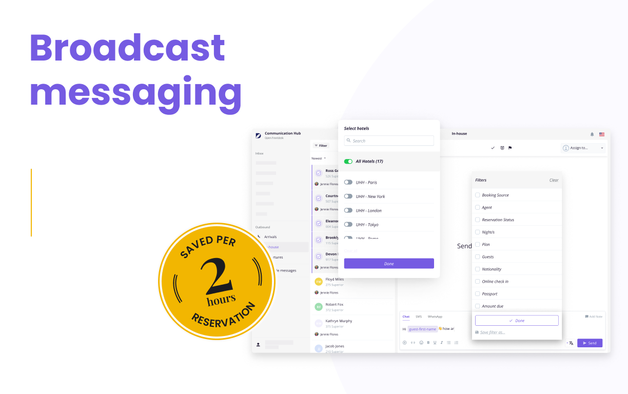 通信中心是客人参与控制中心,酒店经营者可以在其中查看、自动化、管理和定制所有客人的交流和对话。 Duve 通信中心是整个 Duve 数字客户体验整体平台的一部分,包括在线登记向导、智能追加销售、支付处理、品牌客户应用程序、数字钥匙、数字结账和通信中心。您可以选择要启用系统的哪些部分。 ● 预先安排的消息 发送您的客人定制的预先安排的消息,具有独特的分段。 ● 通过WhatsApp、SMS 或与您的内部客人聊天的实时广播宣布今天晚些时候发生的欢乐时光,或为下周入住的客人提供特别优惠,只需单击一个按钮即可。 ● 自动翻译 Duve 可以自动翻译所有聊天消息和对话,以便您和您的客人都以您的母语接收它们 ● SMS 和 WhatsApp 消息 通过您在一个地方连接的所有渠道与客人交流,包括聊天、 WhatsApp、SMS 等), ● 共享笔记 通知团队成员与客人的任何重要问题,或使用内部笔记突出显示对话的重要部分 ● 优先化和暂停 将客人消息标记为优先级或安排对话在大多数情况下重新出现相关的通信中心是客人参与控制中心,酒店经营者可以在其中查看、自动化、管理和定制所有客人的交流和对话。 Duve 通信中心是整个 Duve 数字客户体验整体平台的一部分,包括在线登记向导、智能追加销售、支付处理、品牌客户应用程序、数字钥匙、数字结账和通信中心。您可以选择要启用系统的哪些部分。 ● 预先安排的消息 发送您的客人定制的预先安排的消息,具有独特的分段。 ● 通过WhatsApp、SMS 或与您的内部客人聊天的实时广播宣布今天晚些时候发生的欢乐时光,或为下周入住的客人提供特别优惠,只需单击一个按钮即可。 ● 自动翻译 Duve 可以自动翻译所有聊天消息和对话,以便您和您的客人都以您的母语接收它们 ● SMS 和 WhatsApp 消息 通过您在一个地方连接的所有渠道与客人交流,包括聊天、 WhatsApp、SMS 等), ● 共享笔记 通知团队成员与客人的任何重要问题,或使用内部笔记突出显示对话的重要部分 ● 优先化和暂停 将客人消息标记为优先级或安排对话在大多数情况下重新出现相关的